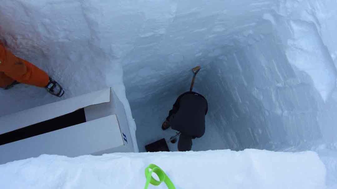 The drill team also dug pits by hand in order to perform other studies. Seth Campbell is down about 12 feet deep in this hand-dug pit. Mount Hunter Ice divide, Denali National Park, Alaska.