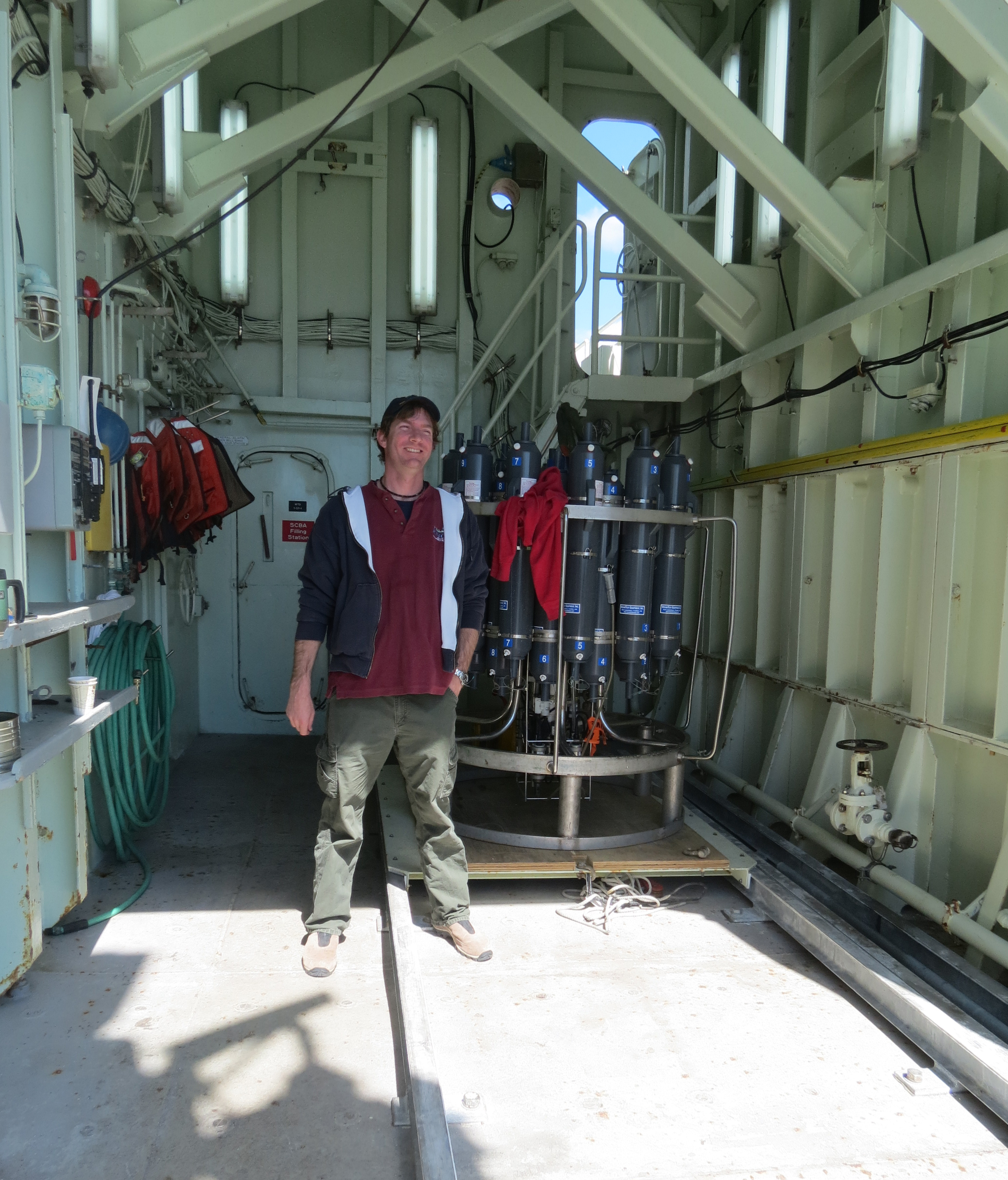 Captain Sheasley of the Research Vessel Knorr stands in the starboard deck hanger with a CTD unit. CTD is an acronym for Conductivity, Temperature and Depth, three ocean variables that are measured within this cluster of devices. The door behind him leads directly to the ships Wet Lab. Aboard the docked Research Vessel Knorr. Woods Hole Oceanographic Institution, Woods Hole, Massachusetts.