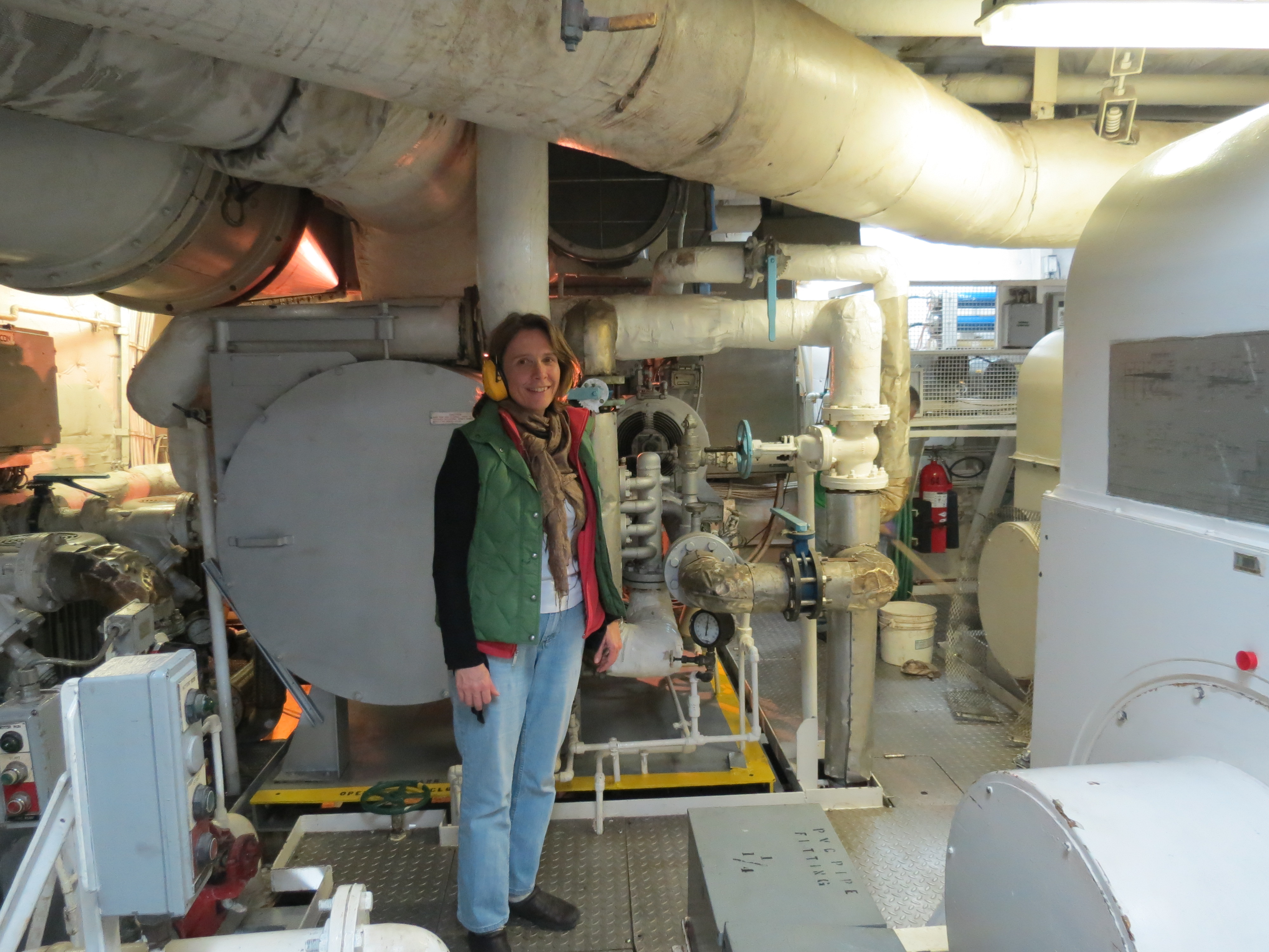 Lisa Seff wears ear protection in one section of the Machinery Room. Aboard the docked Research Vessel Knorr. Woods Hole Oceanographic Institution, Woods Hole, Massachusetts.