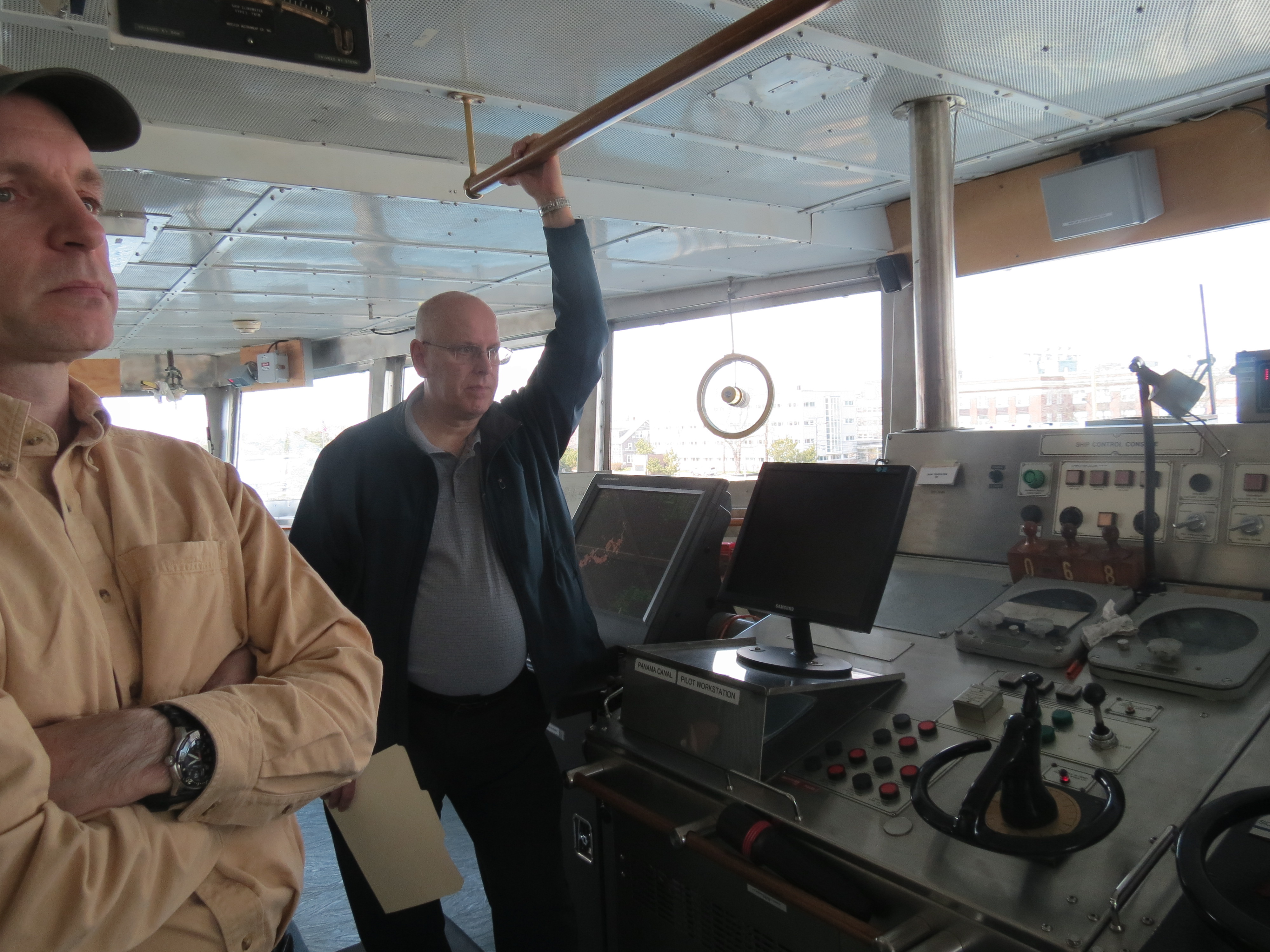 Captain Sheasley explains the Dynamic Positioning System onboard the Research Vessel Knorr as Dr. Robert Campbell (left) and Al Suchey (right) listen in. Woods Hole Oceanographic Institution, Woods Hole, Massachusetts.