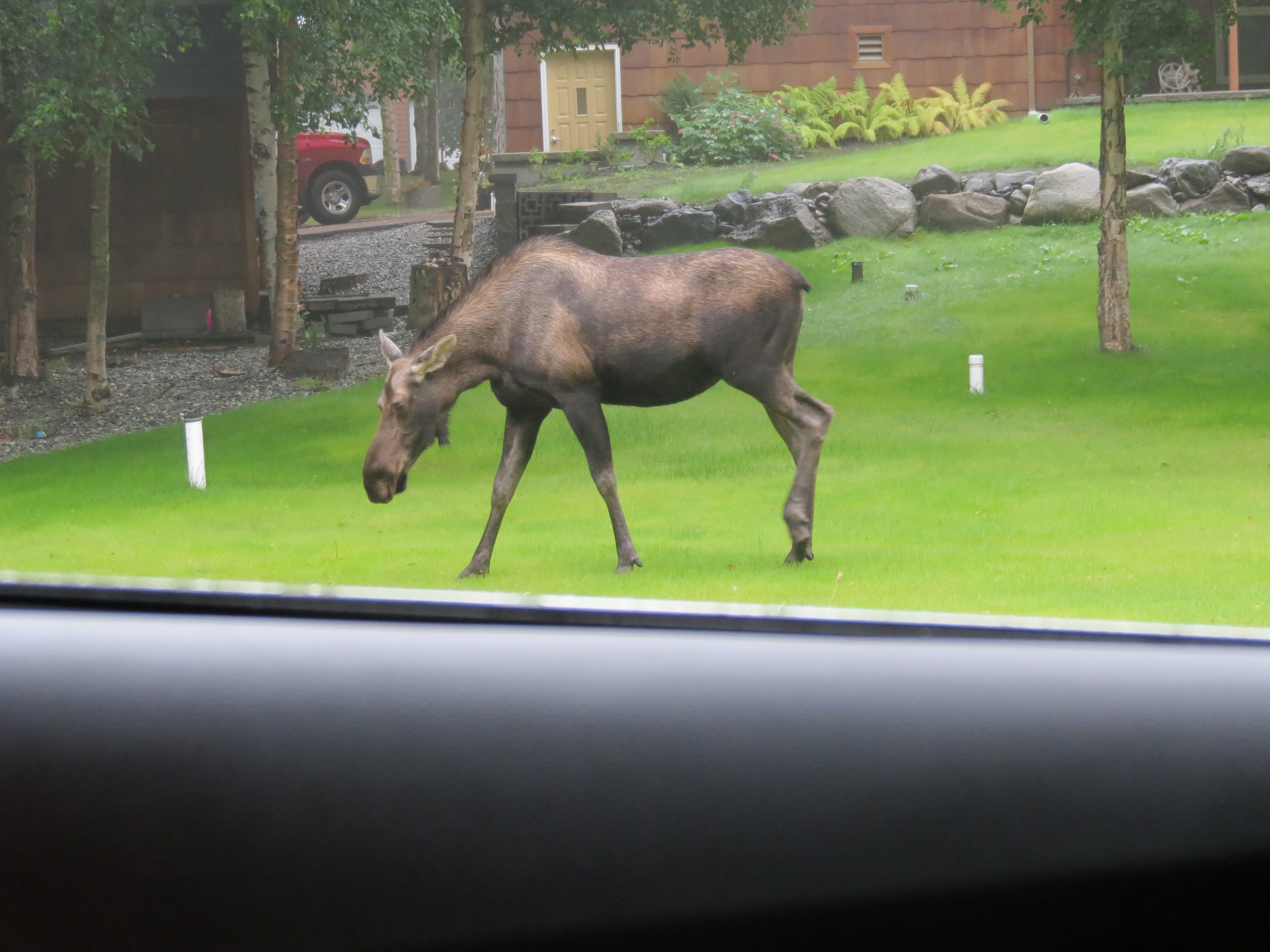 Lisa Seff: "Moose sighting off the port side of our car while driving through the suburbs of Anchorage." Anchorage, Alaska.