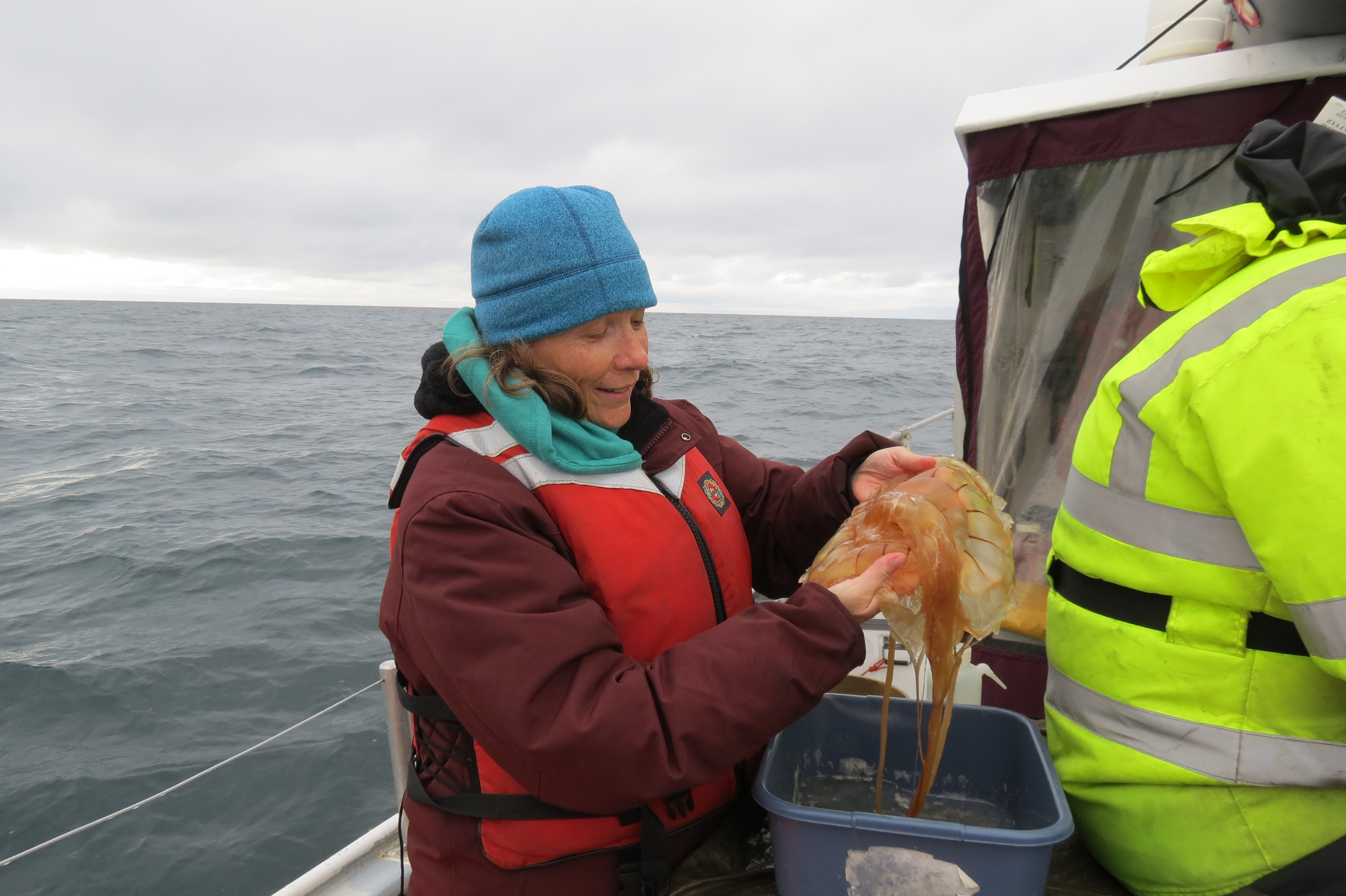 Lisa Seff wears her life jacket while inspecting some interesting marine life. Aboard the Research Vessel Ukpik. Beaufort Sea Transect #6, Arctic Ocean.