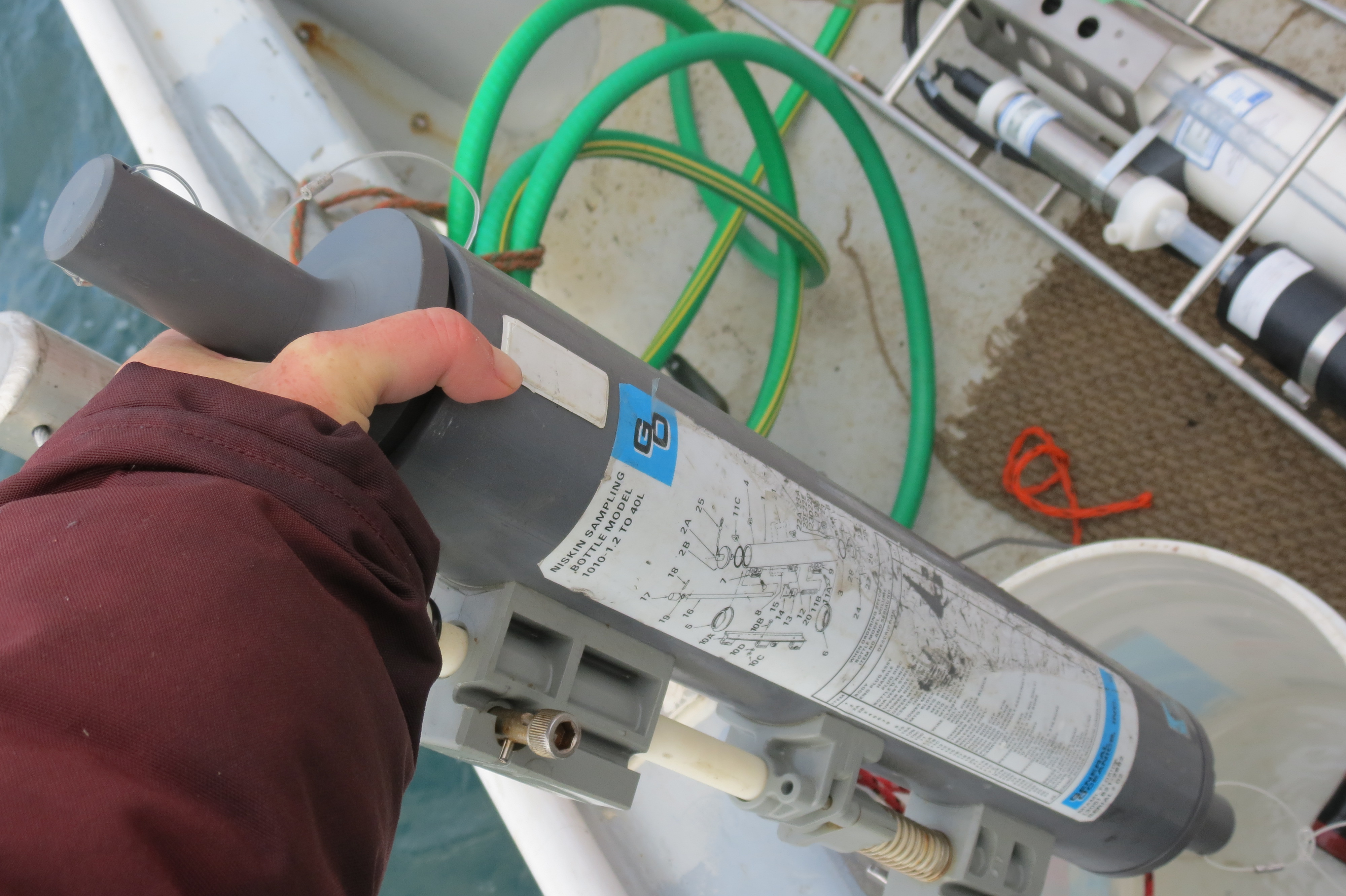 Niskon water sample collection bottle. Aboard the Research Vessel Ukpik. Beaufort Sea Transect #6, Arctic Ocean.