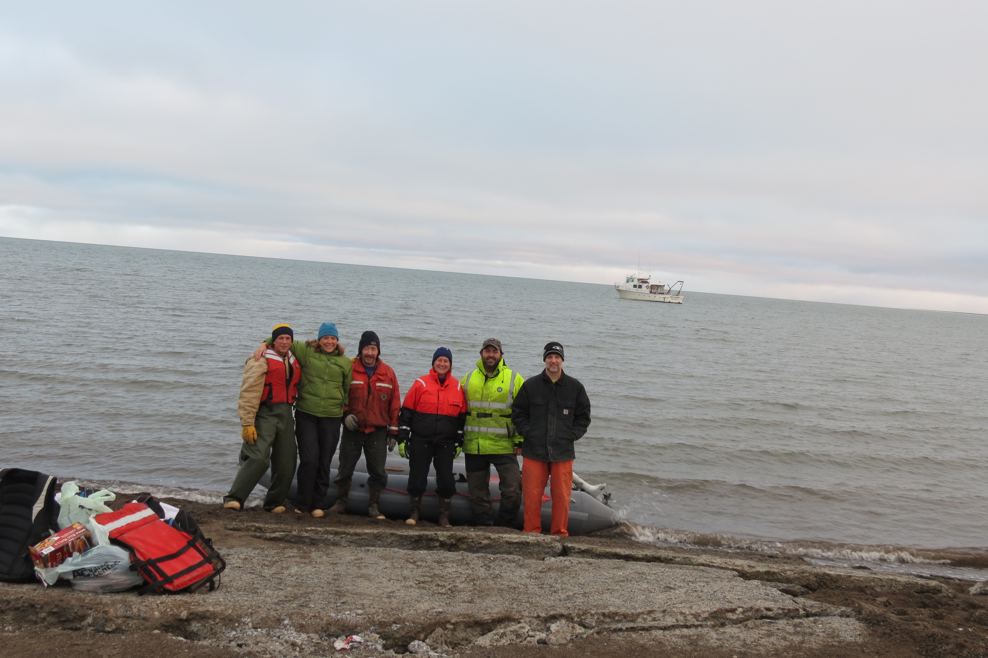 The final day for the PolarTREC expedition team in Barrow. Left to right: Dr. Steve Okkonen, Lisa Seff, Captain Bill Kopplin, Dr. Carin Ashjian, Co-captain Mike Fleming, and Dr. Robert Campbell. The research vessel Ukpik is in the backround ready to head back to Prudhoe Bay. Barrow, Alaska.
