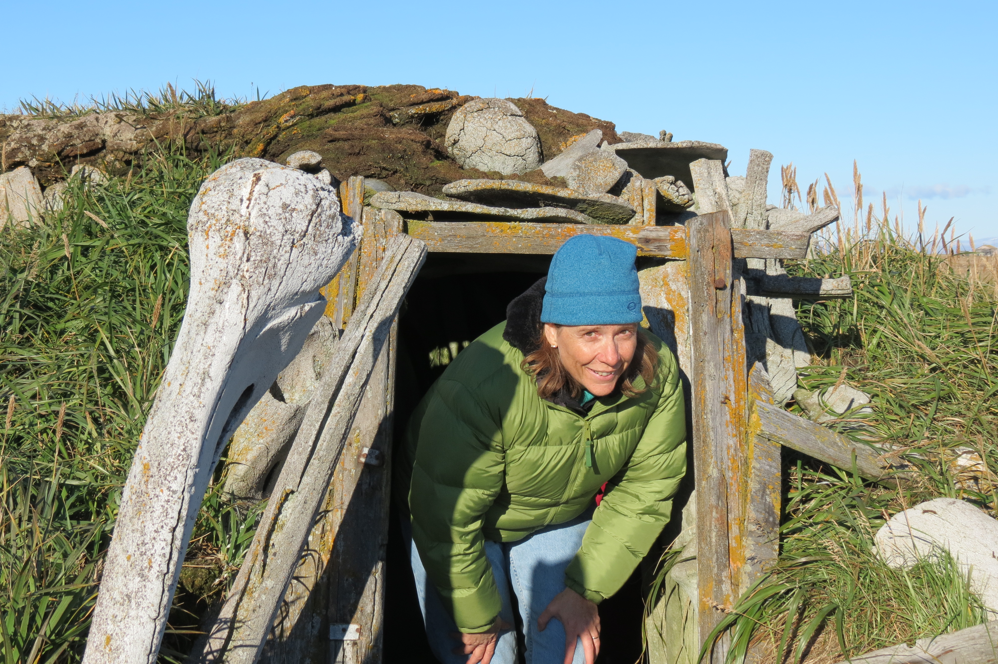 Lisa Seff exits a sod home. Sod homes are built of whale bones and sod. Point Hope, Alaska.