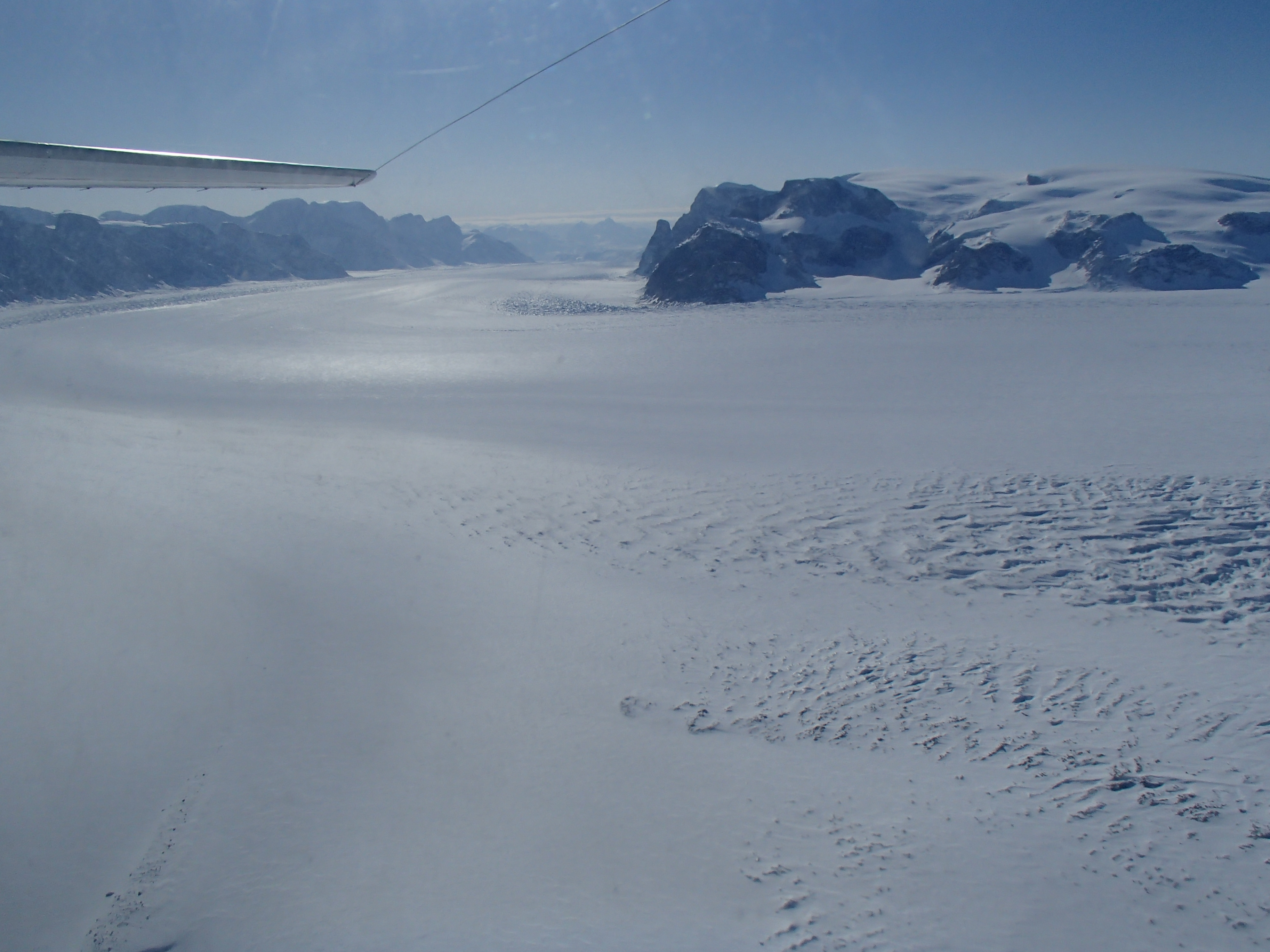 A view back at this glacial valley that the plane had just flown up. Greenland.