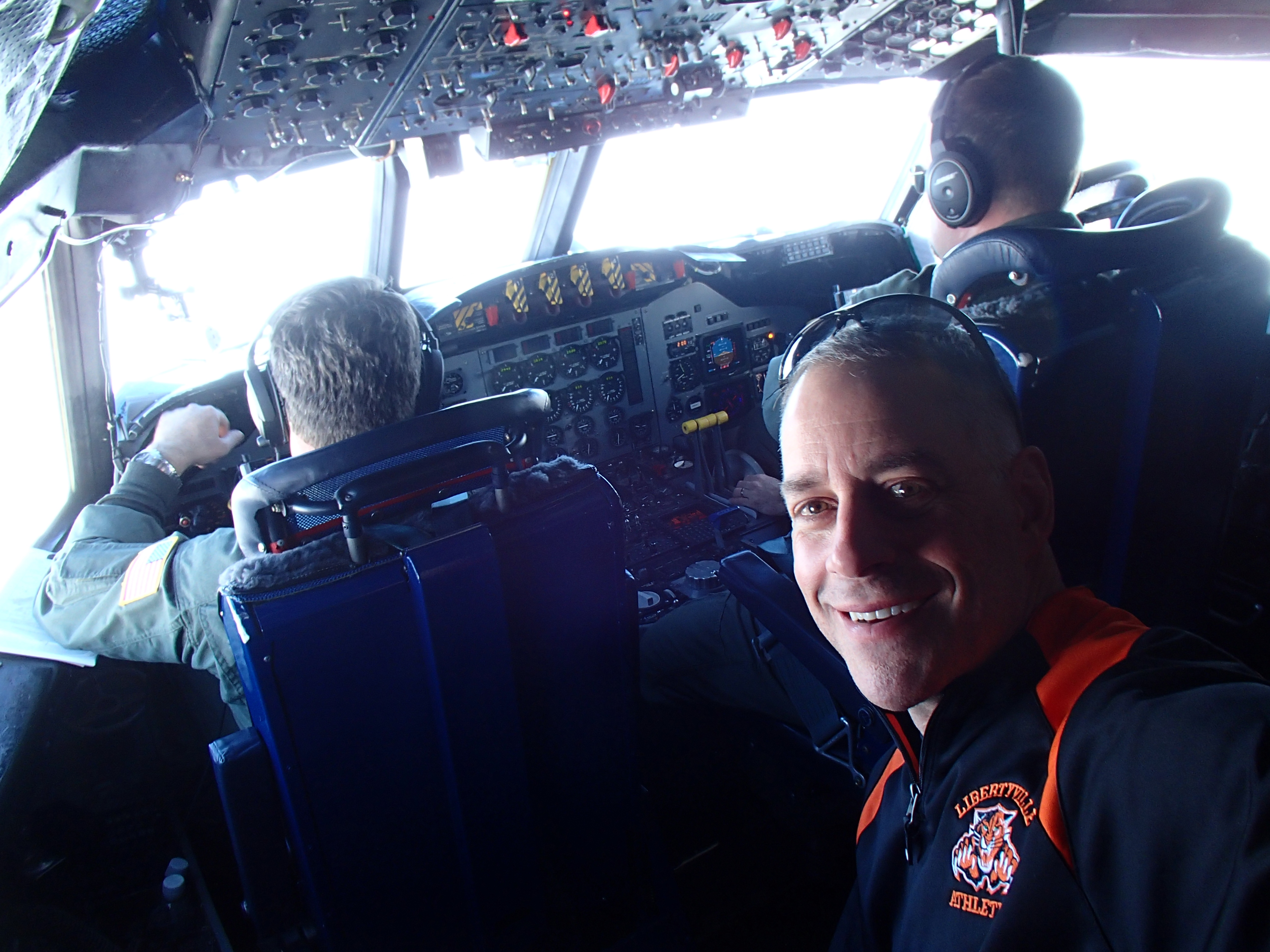 Mark Buesing on the flight deck, while sitting in the jump seat. Greenland.