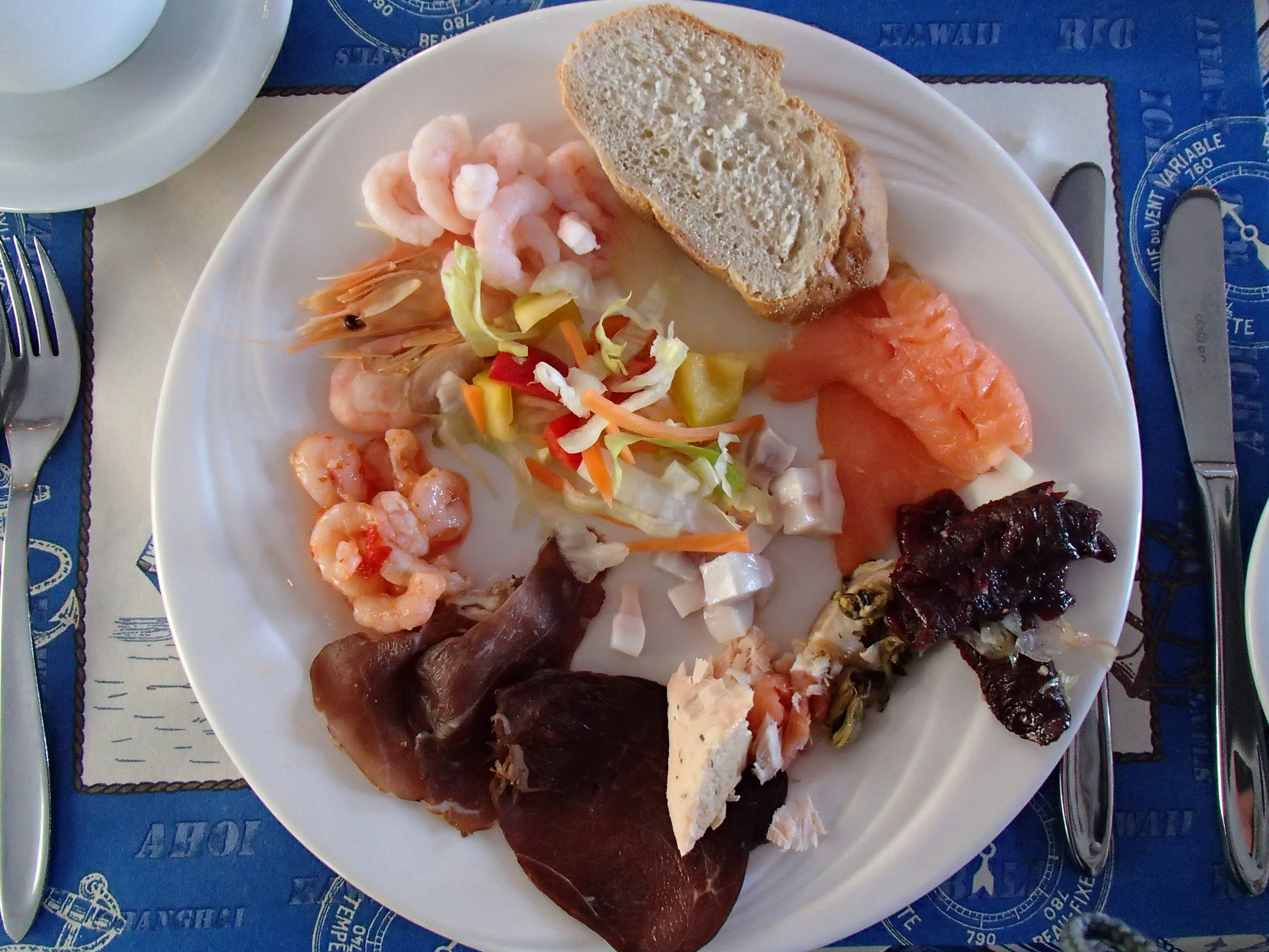 Mark Buesing: "On this plate: reindeer (both raw and cooked), muskox (I'm a big fan), seal (not a fan), whale (including muscle, skin, and blubber), cooked and raw fish (several different kinds, all good), and the other stuff you can probably identify yourself." Kangerlussuaq, Greenland.