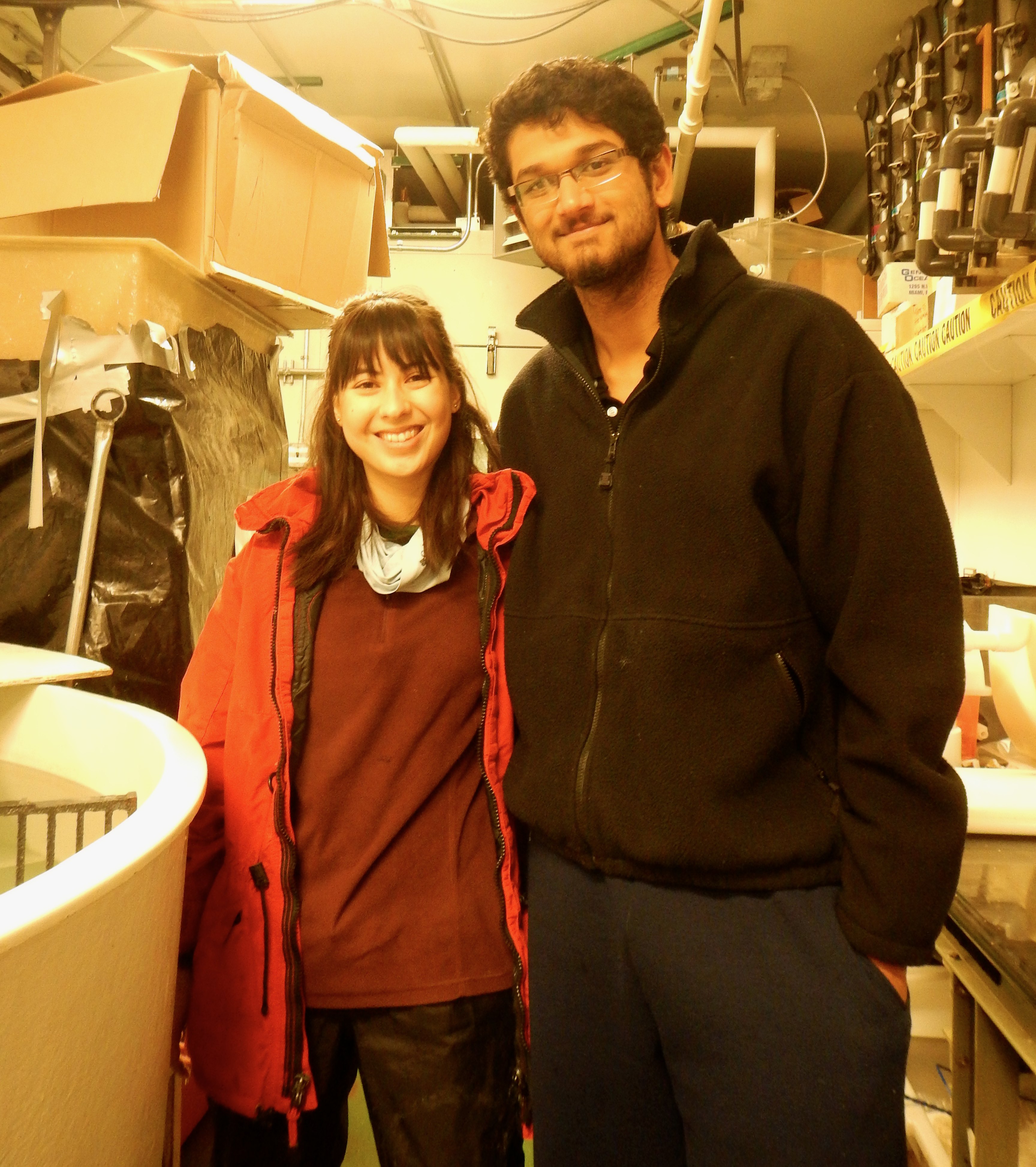 Ashley Nelson and Urjeet Khanwalkar in the aquarium room. Paula Dell: "They are pretty lucky as they are undergrads who had the good fortune of landing a winter research job at Palmer Station." Palmer Station, Antarctica.