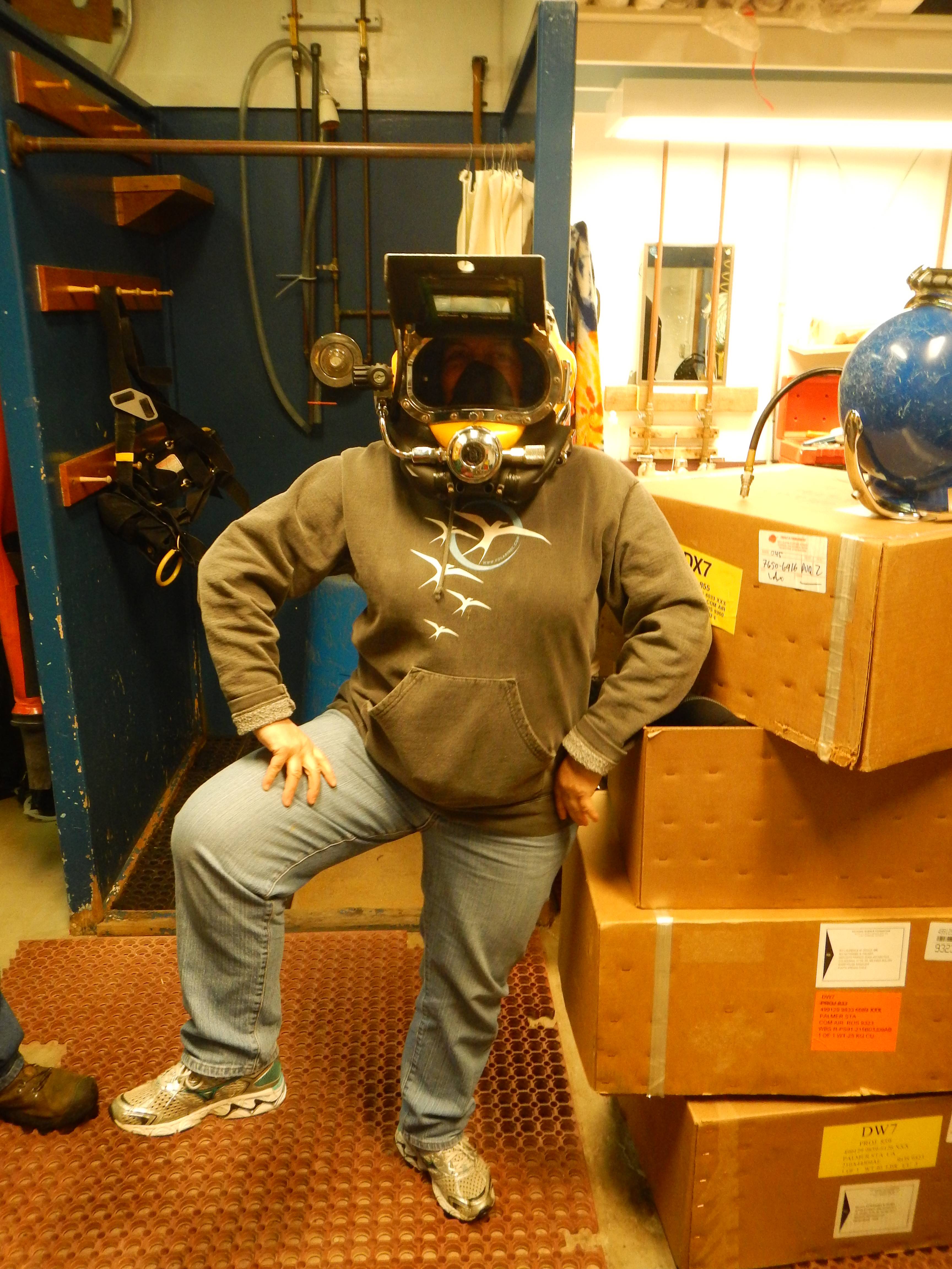 Paula Dell: "You know I had to try it on and show off my captain's balance. All I could think of is hooray for the buoyancy in saltwater." Palmer Station, Antarctica.