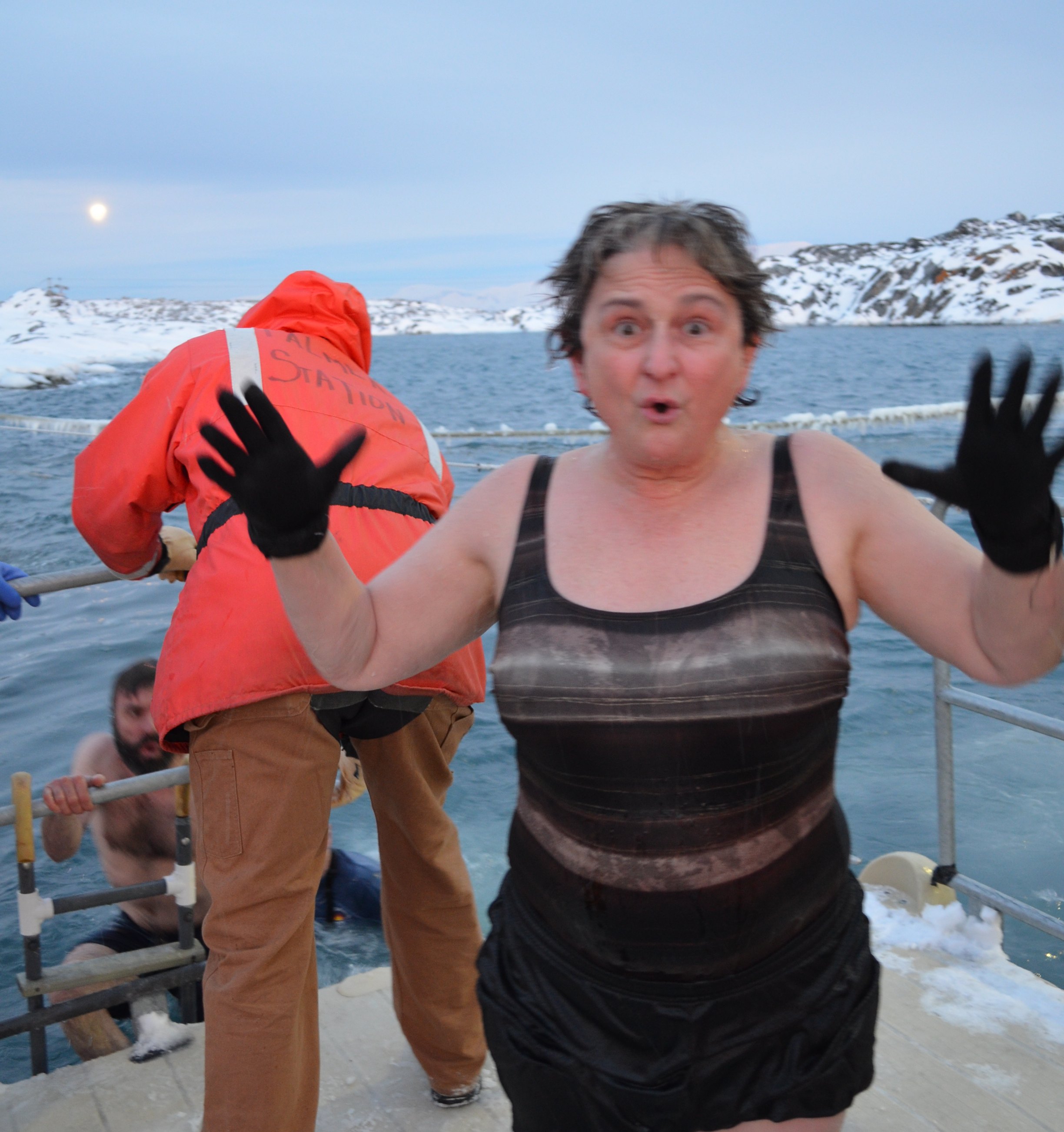 Paula Dell after the Winter Solstice Plunge. Paula Dell: "Very cold water! Everyone's face is proof of that." Palmer Station, Antarctica.