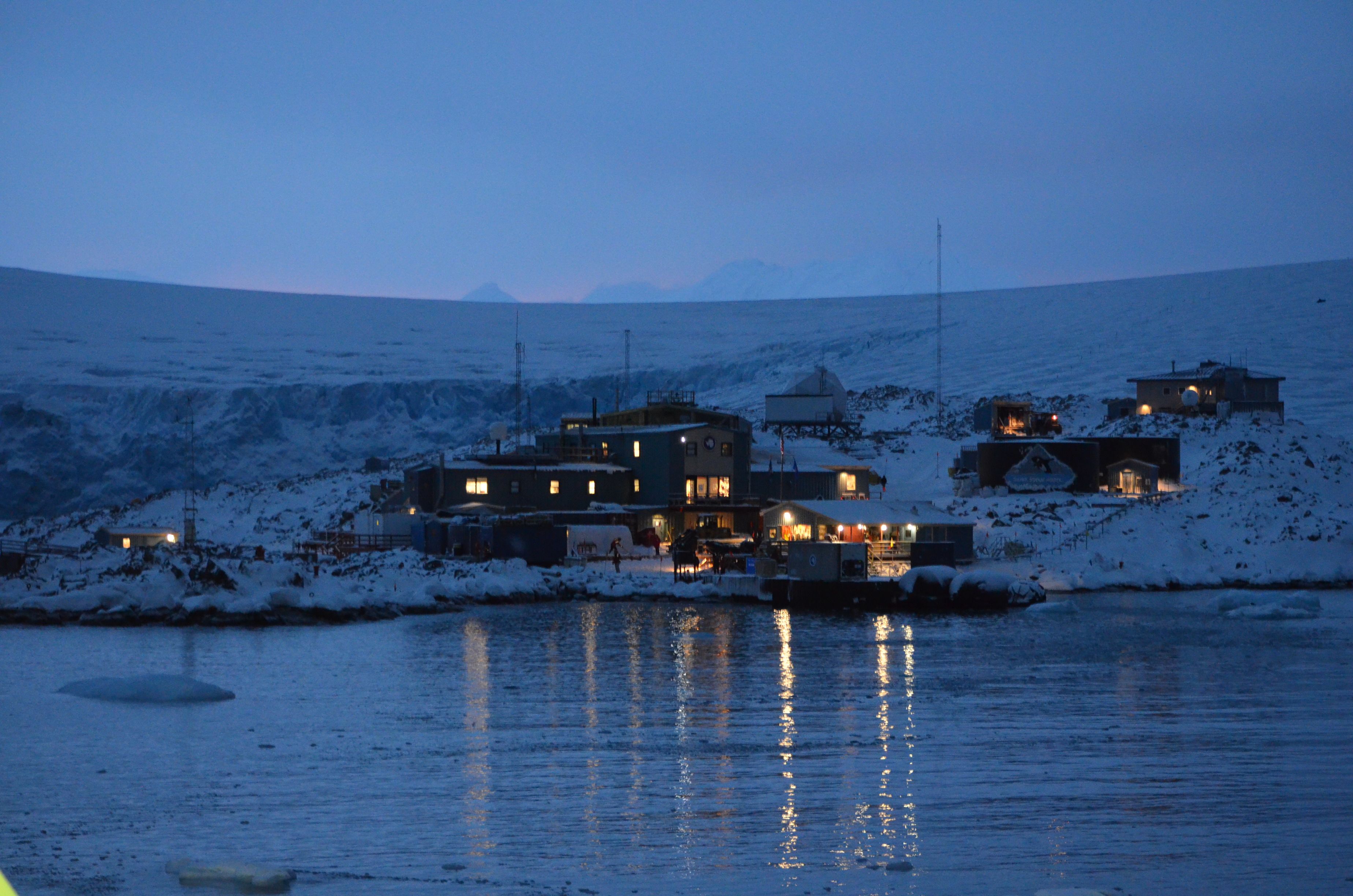Paula Dell: "Palmer Station at daybreak. We managed to get in and dock before the severe winds picked up. Palmer Station never looked so good after our long journey to get here." Arthur Harbor, Palmer Station, Antarctica.