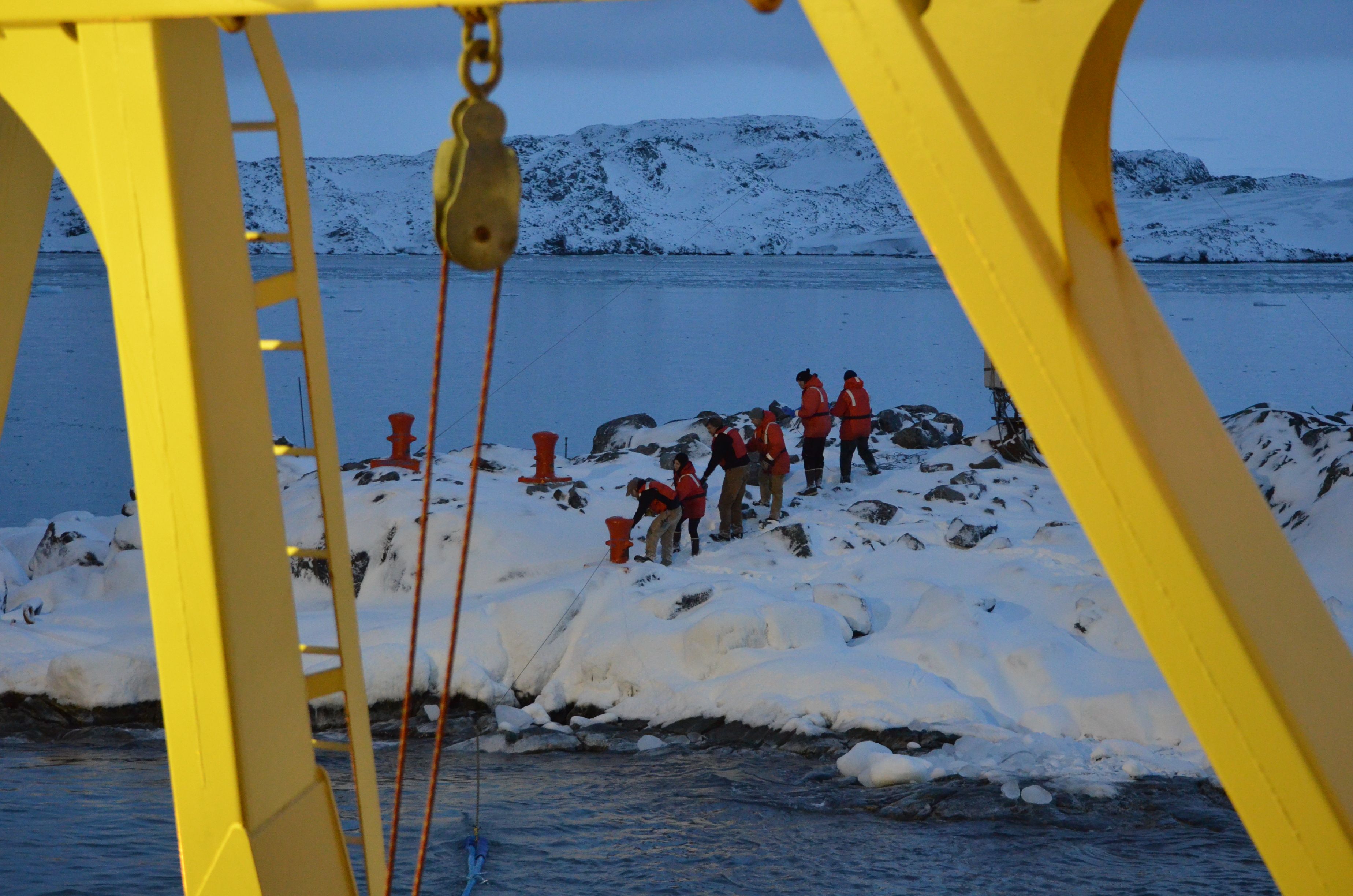 It takes a coordinated, team effort to tie up the RV Laurence M. Gould icebreaker at Palmer Station, Antarctica.