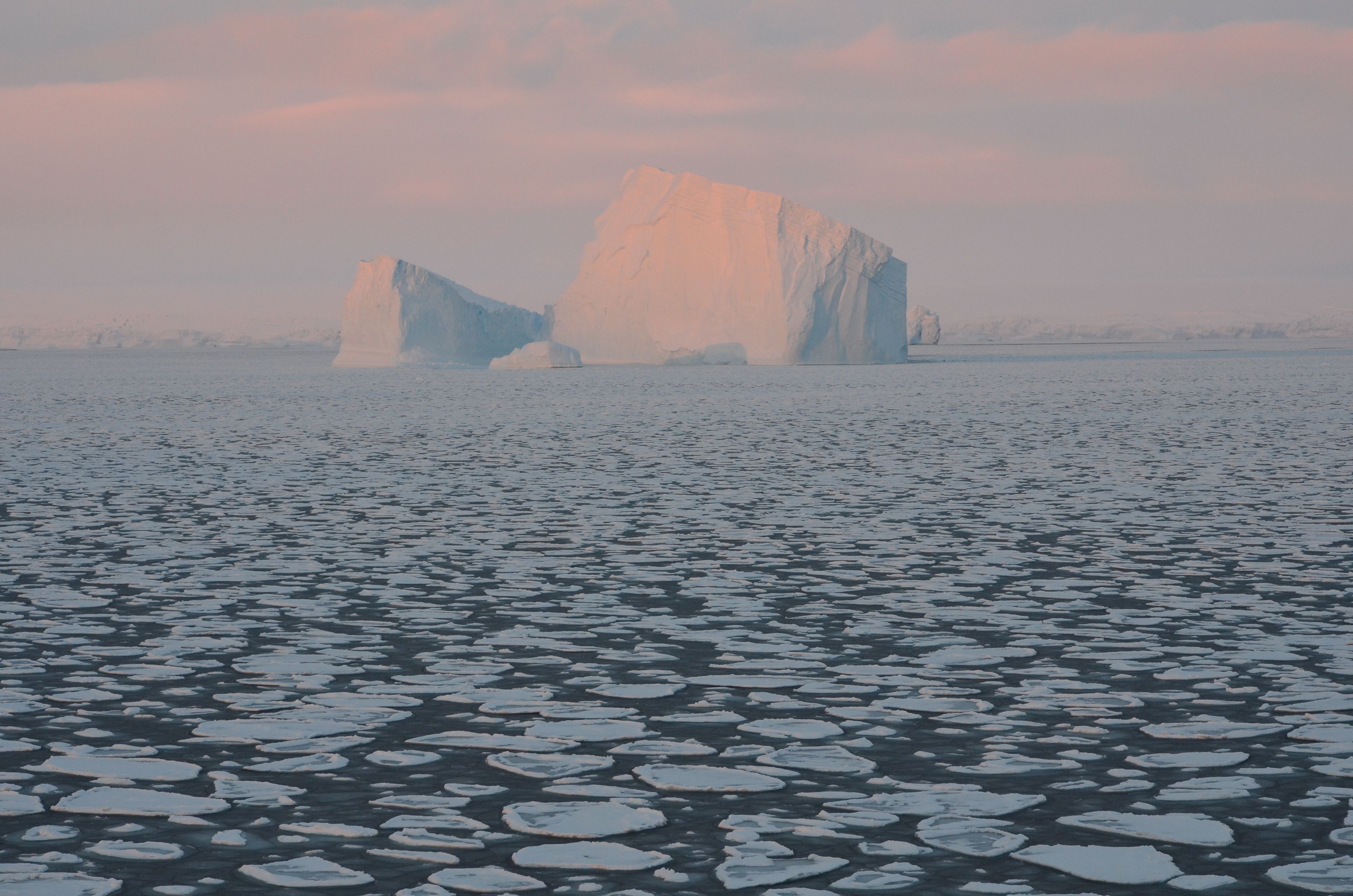 A large iceberg with a sea of pancake ice. West Antarctic Peninsula region, Antarctica.