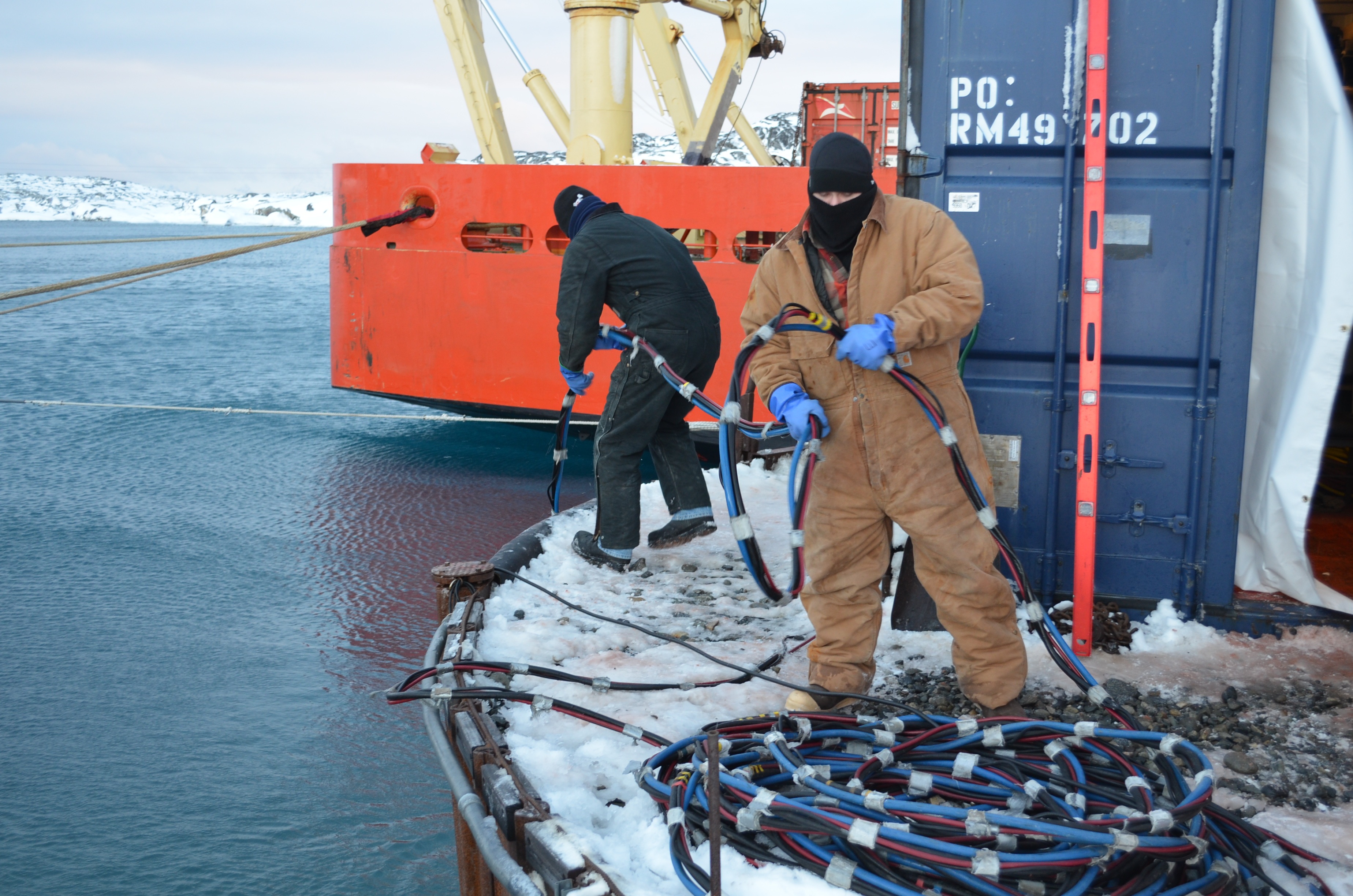 Britt Coates and Christian Clark tend to the diving Steve Rupp, who is underwater working. Palmer Station, Antarctica.