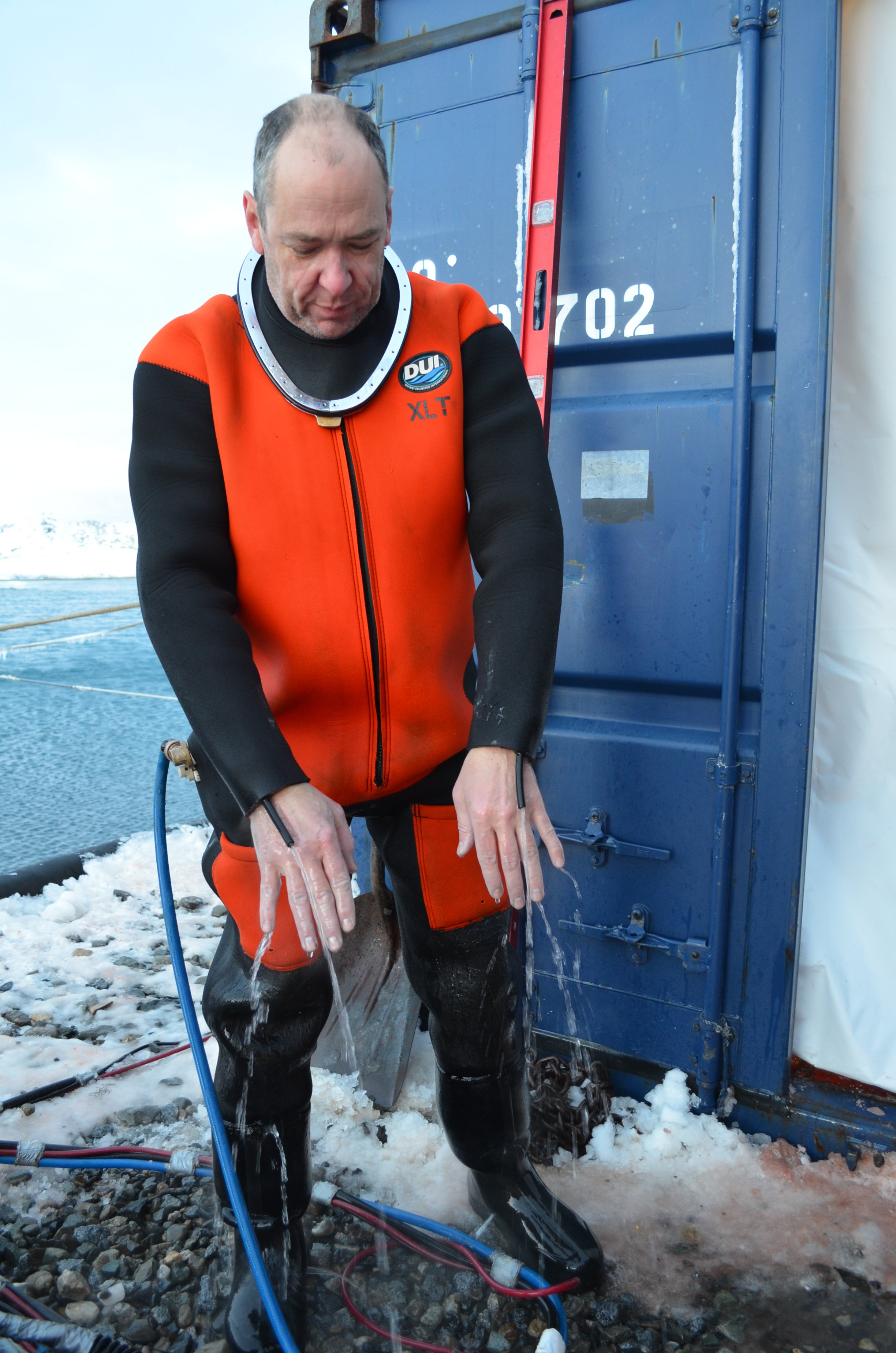 Steve Rupp demonstrates the warm water flow through his suit while he is working in frigid waters. Palmer Station, Antarctica.