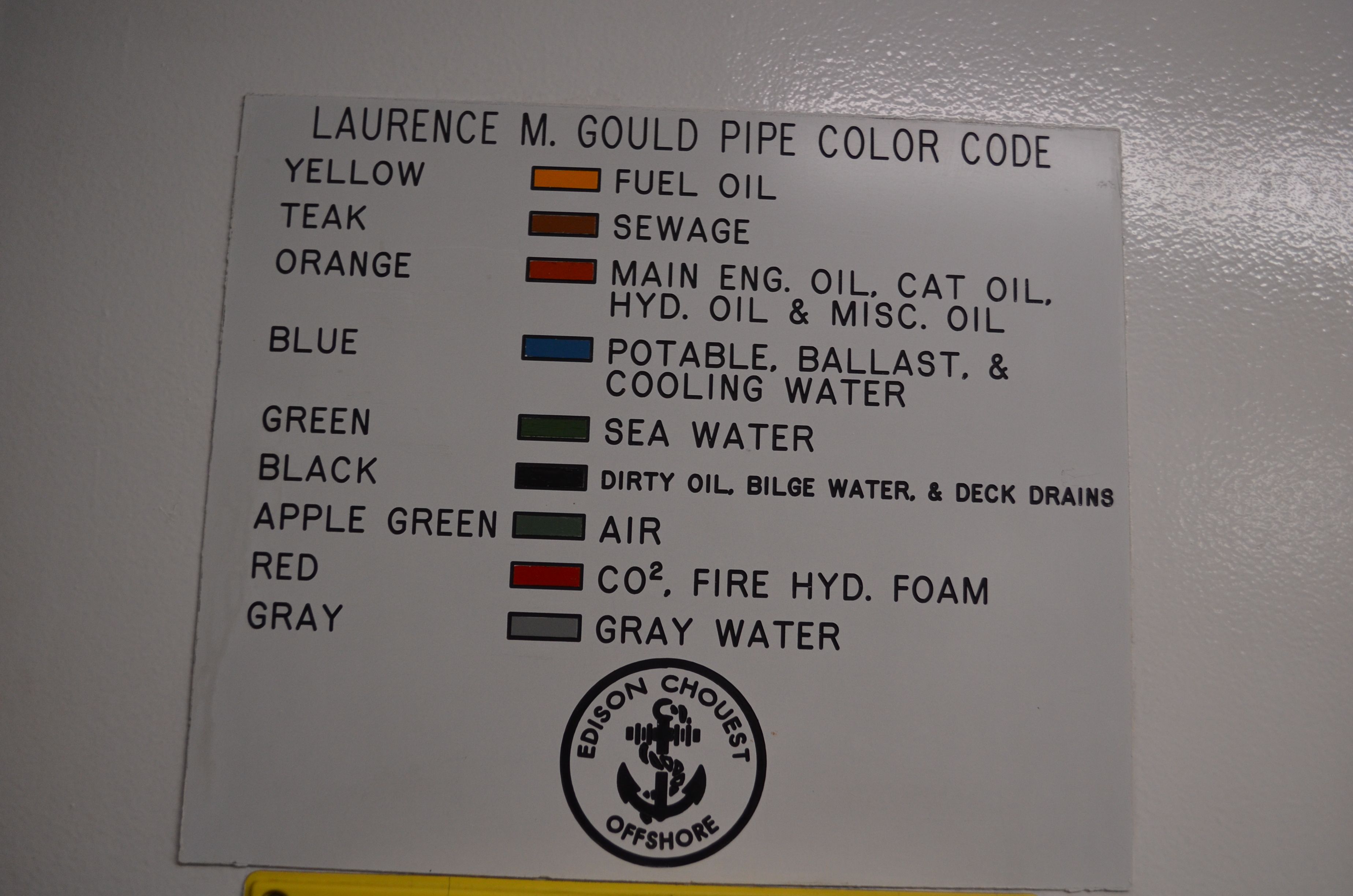 A color-coded chart for the various pipes in the engine room. Aboard the RV Laurence M. Gould icebreaker.