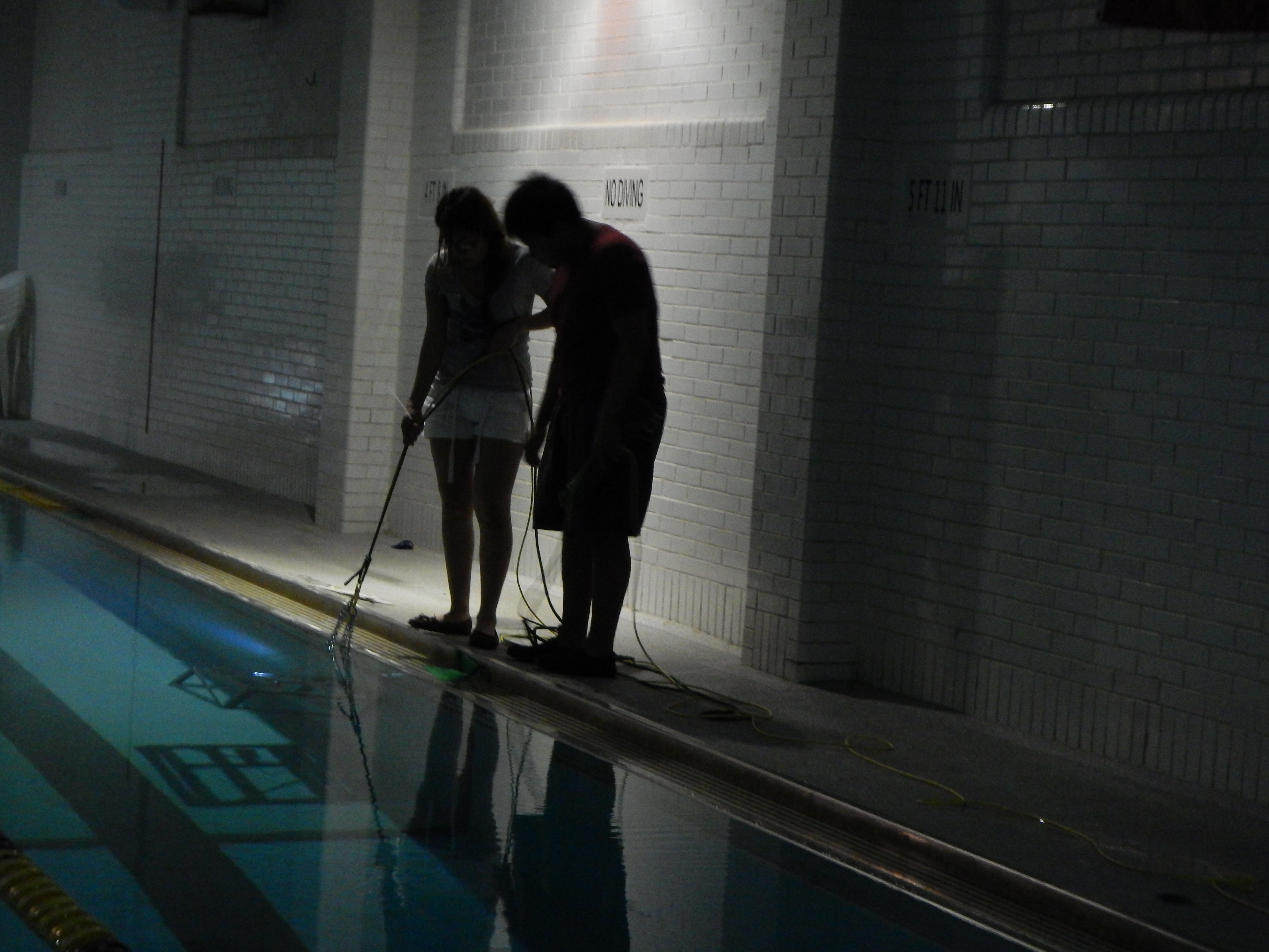 Liliana Diaz and Francisco Flores test out the Fish Spy underwater video camera rig in the Lindblom pool. Lindblom Math & Science Academy Pool, Chicago, Illinois.
