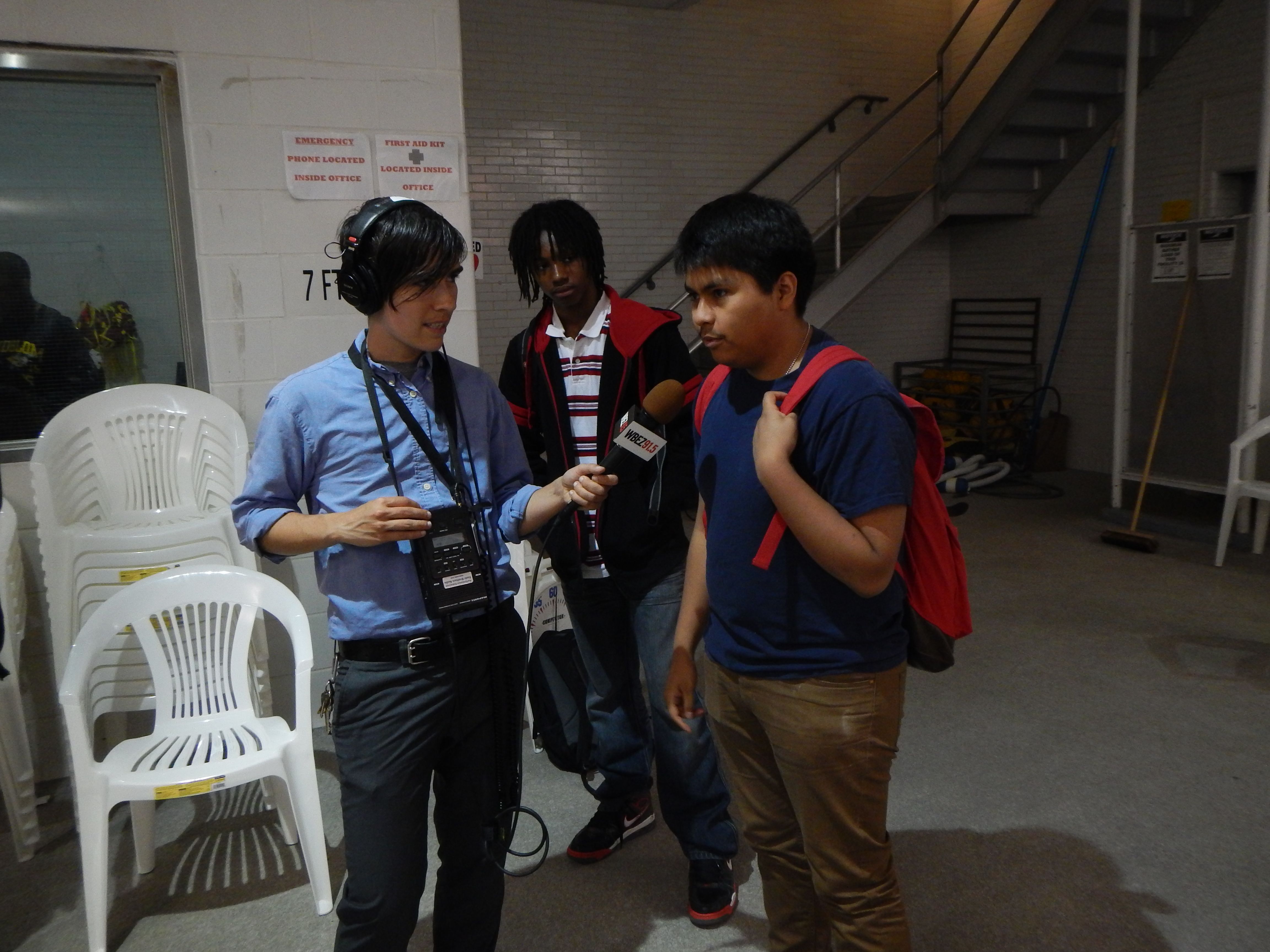 WBEZ (NPR) reporter Lewis Wallace interviews Francisco Flores about the Fish Spy underwater video camera rig, as Raymond Thicklin looks on. Lindblom Math & Science Academy Pool, Chicago, Illinois.