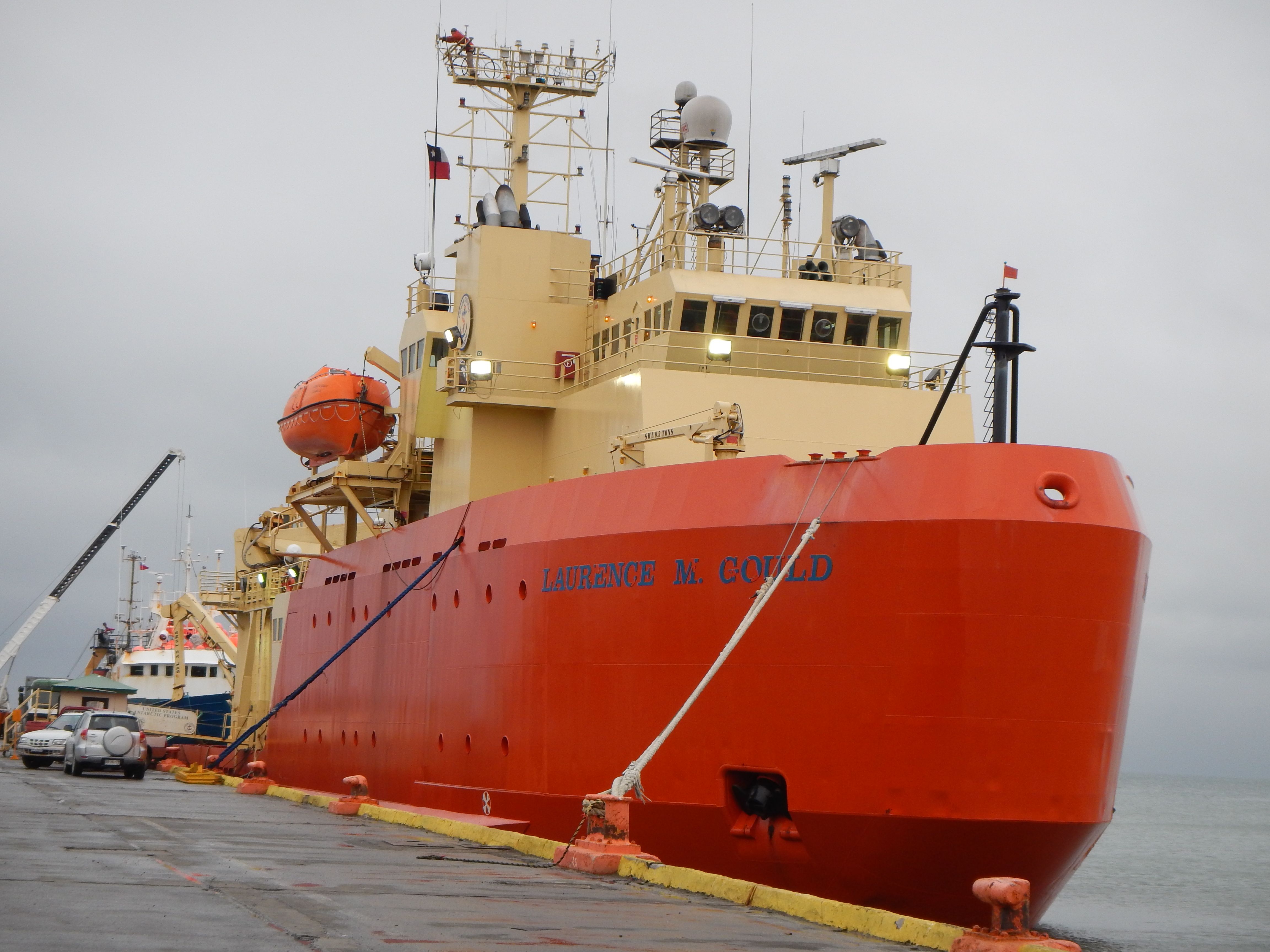 The Laurence M. Gould is docked at Punta Arenas, Chile, getting ready to sail south.