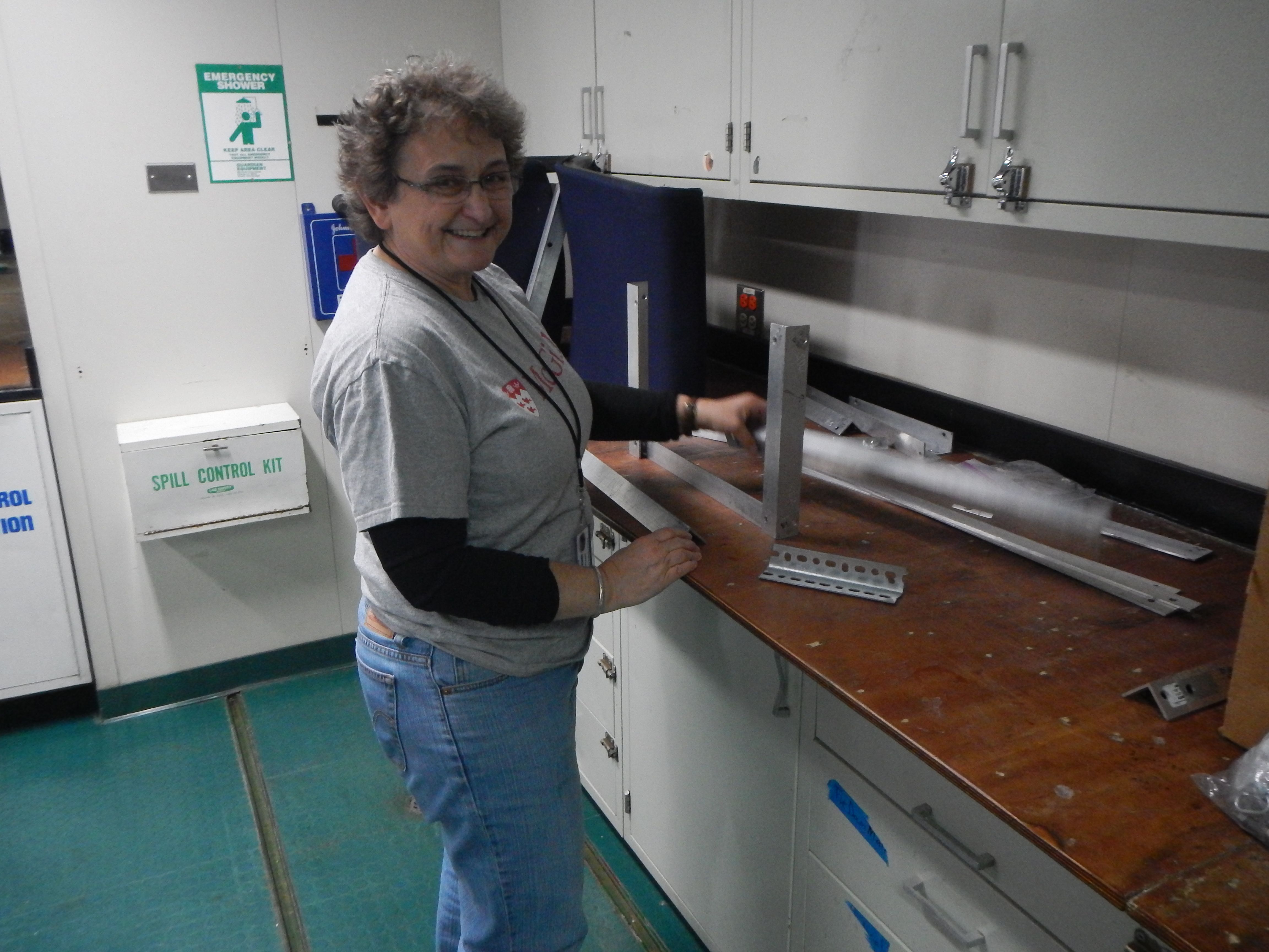 Paula Dell reassembles the Fish Spy aboard the RV Laurence M. Gould icebreaker.