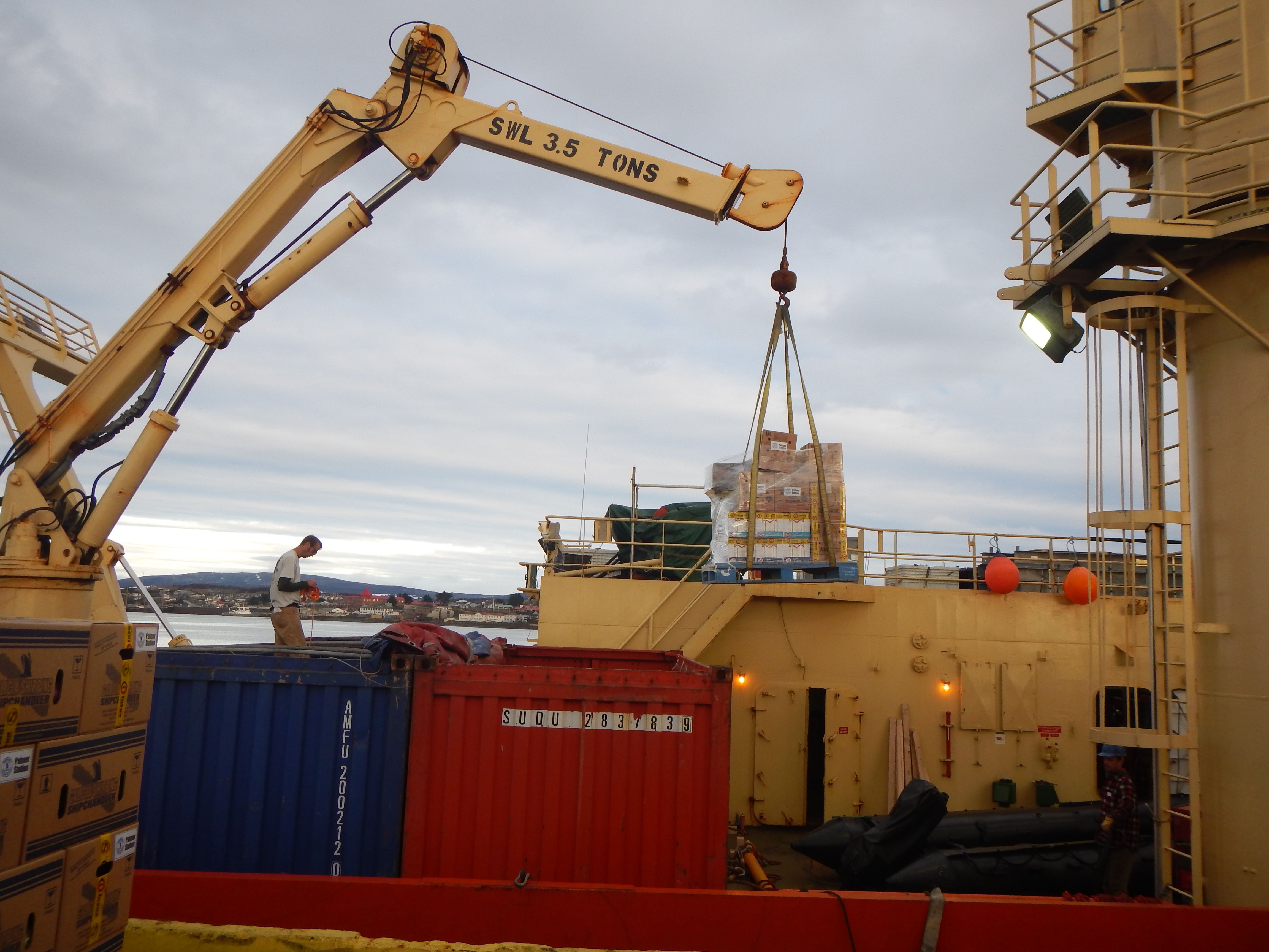Loading cargo on the RV Laurence M. Gould icebreaker at the docks in Punta Arenas, Chile.