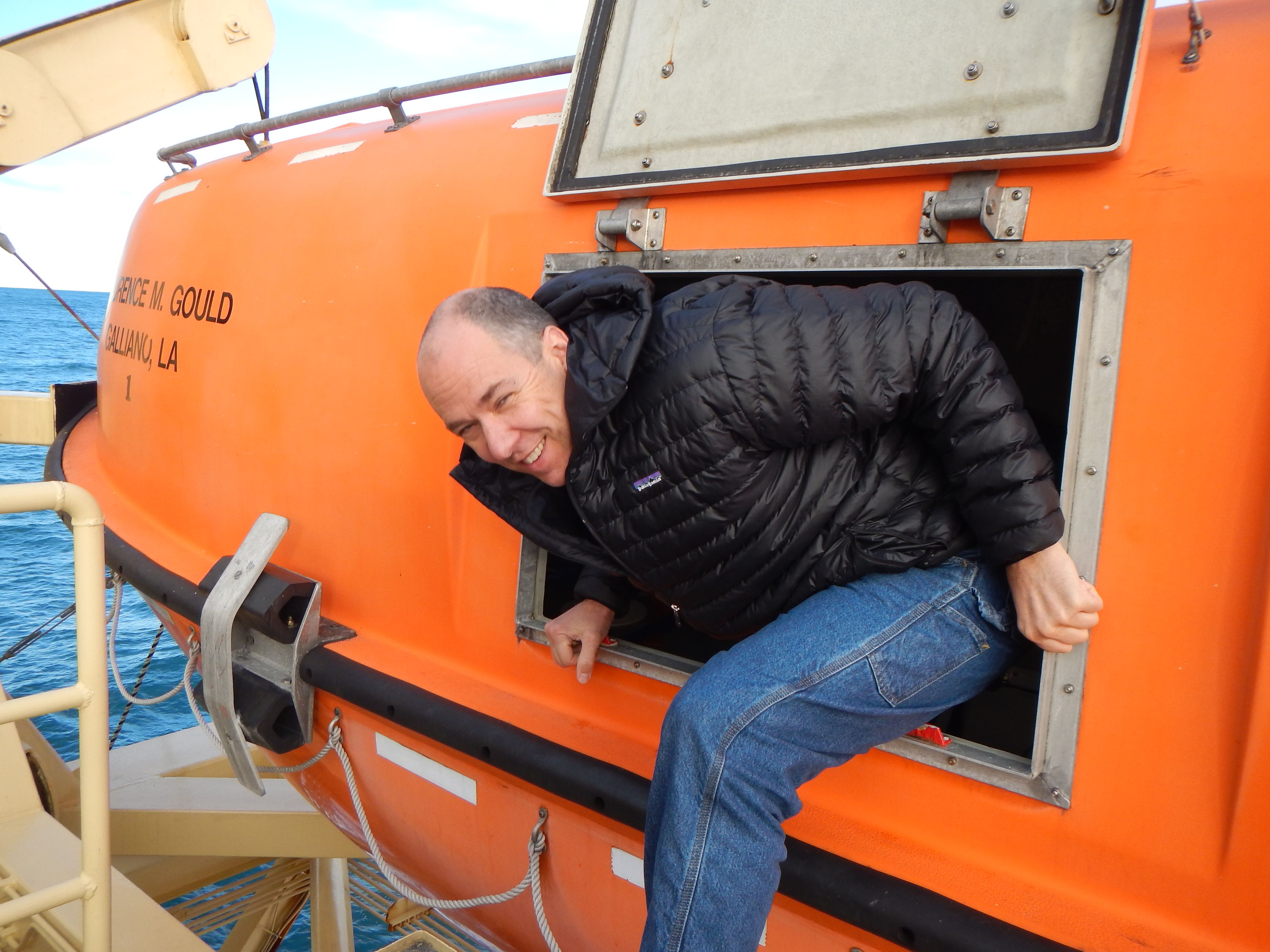 The exit hatch from the lifeboat. Aboard the RV Laurence M. Gould icebreaker.
