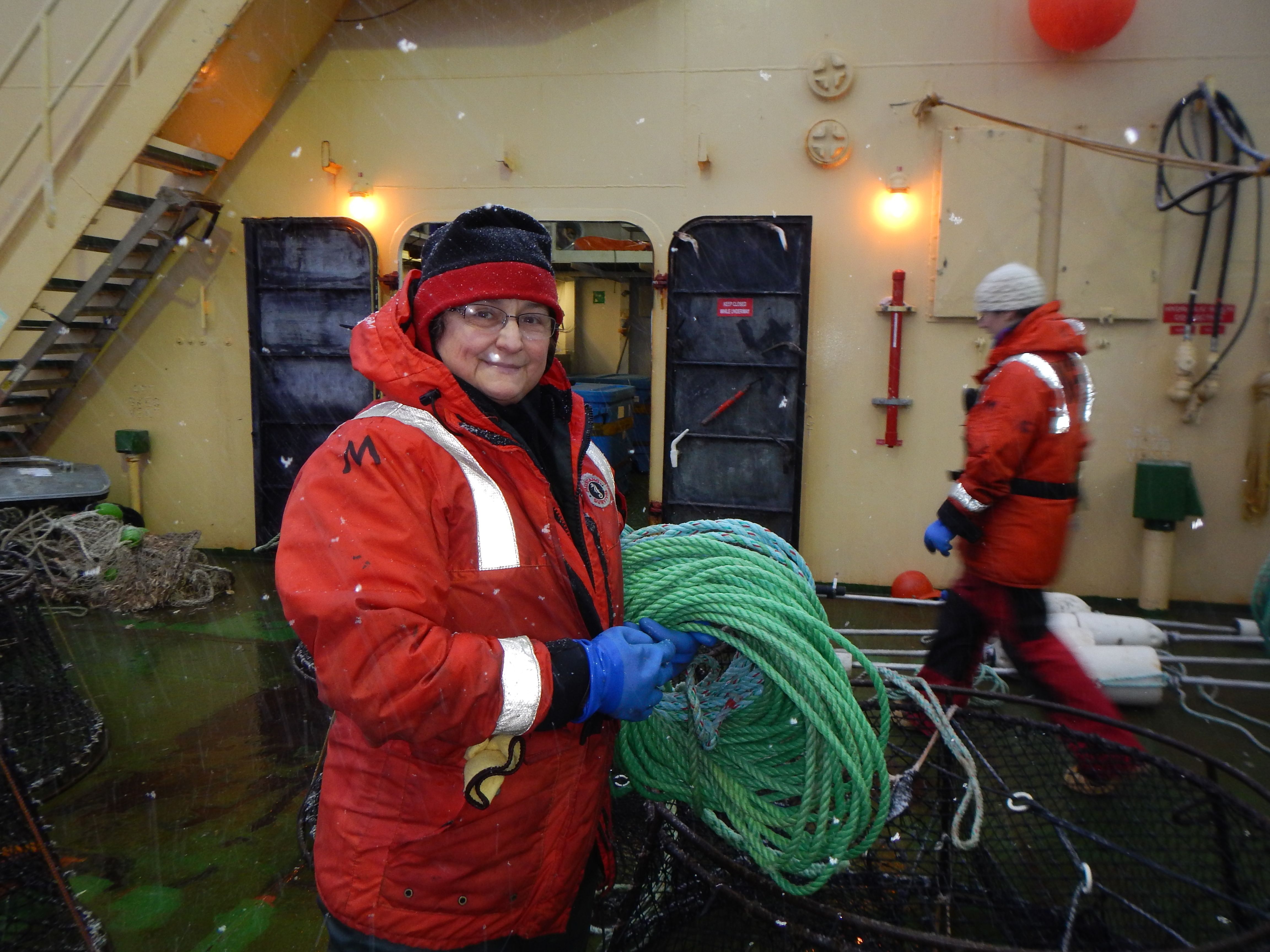Paula Dell prepares to deploy the fish pots. Aboard the RV Laurence M. Gould icebreaker.