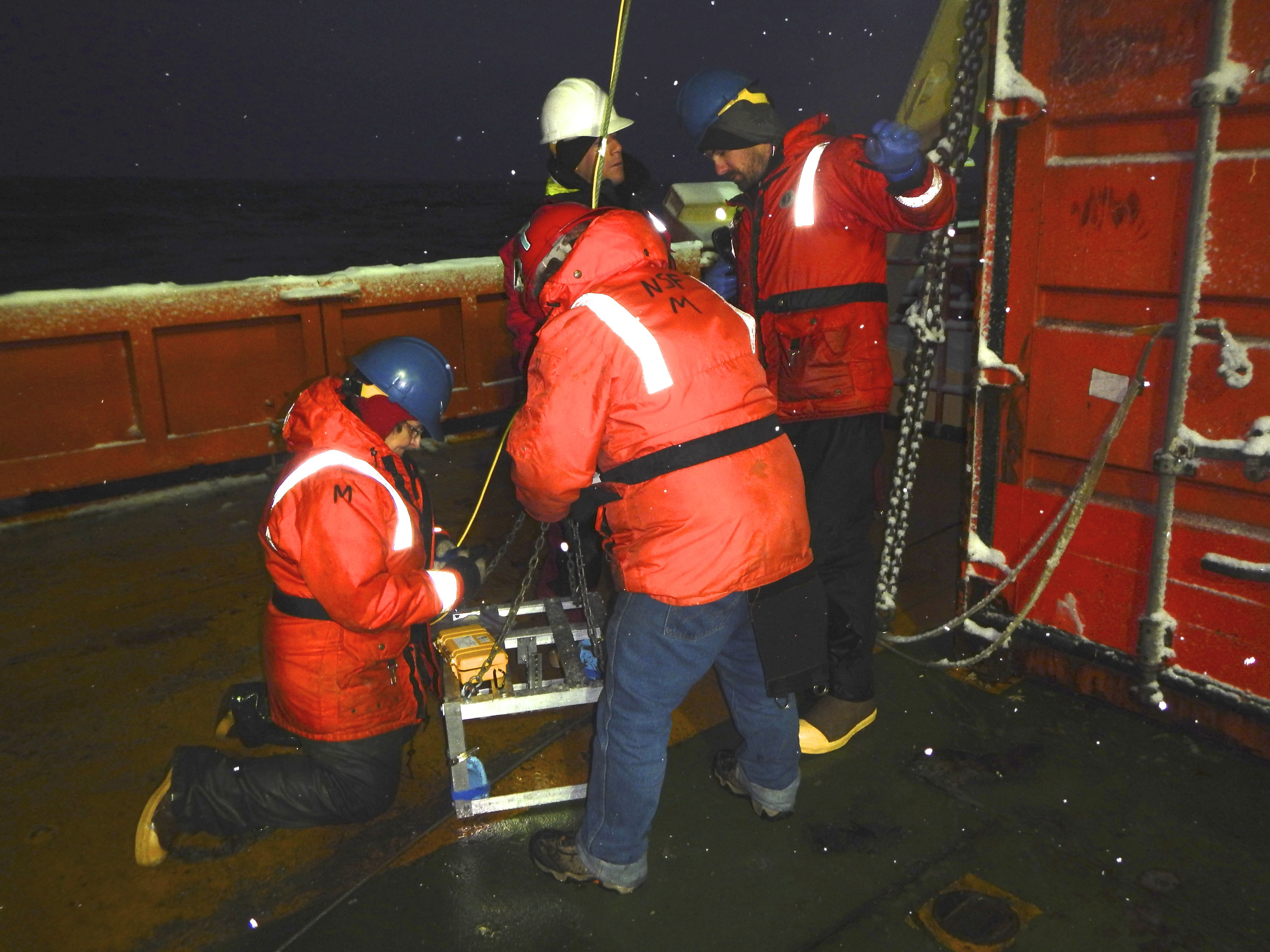 Paula Dell and marine tech, Kevin Pedigo, prepare the Fish Spy for her first deployment. Aboard the RV Laurence M. Gould icebreaker.