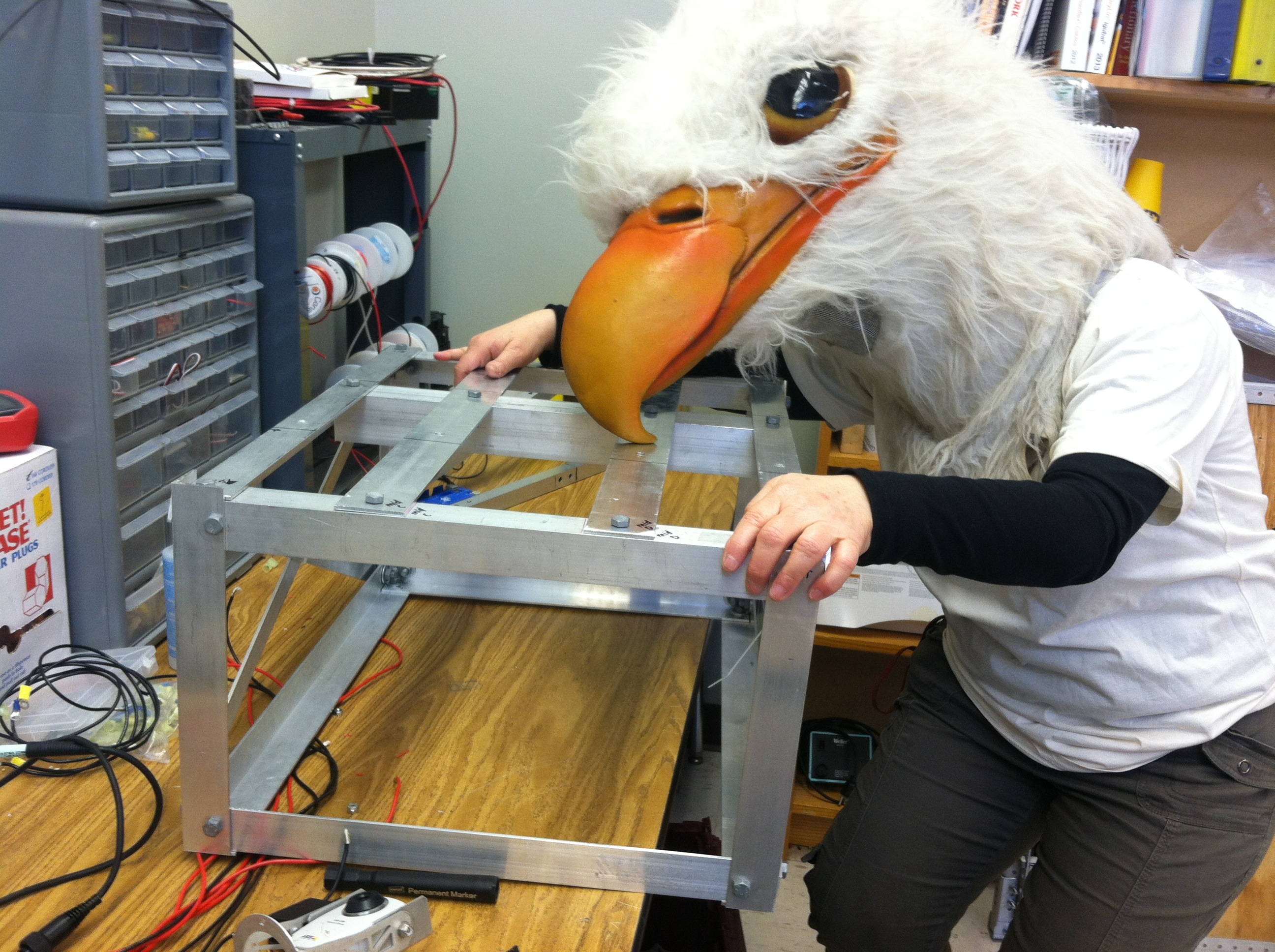 The Lindblom Eagle mascot proudly hugs the Fish Spy. Lindblom Math & Science Academy, Chicago, Illinois.