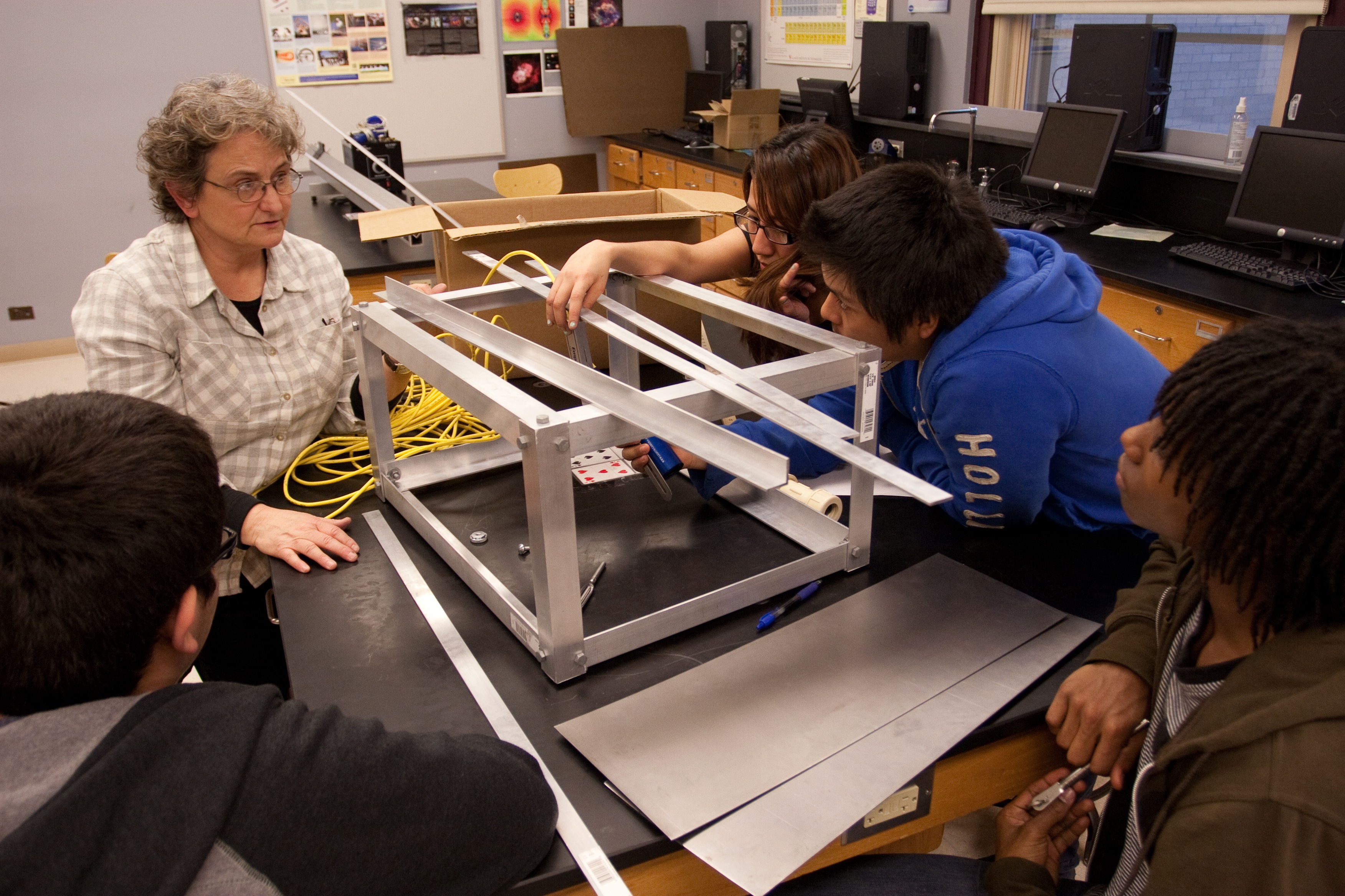 Paula Dell, Liliana Diaz, Francisco Flores, Raymond Thicklin, and Miguel Limon consult on the Fish Spy design. Lindblom Math & Science Academy, Chicago, Illinois.