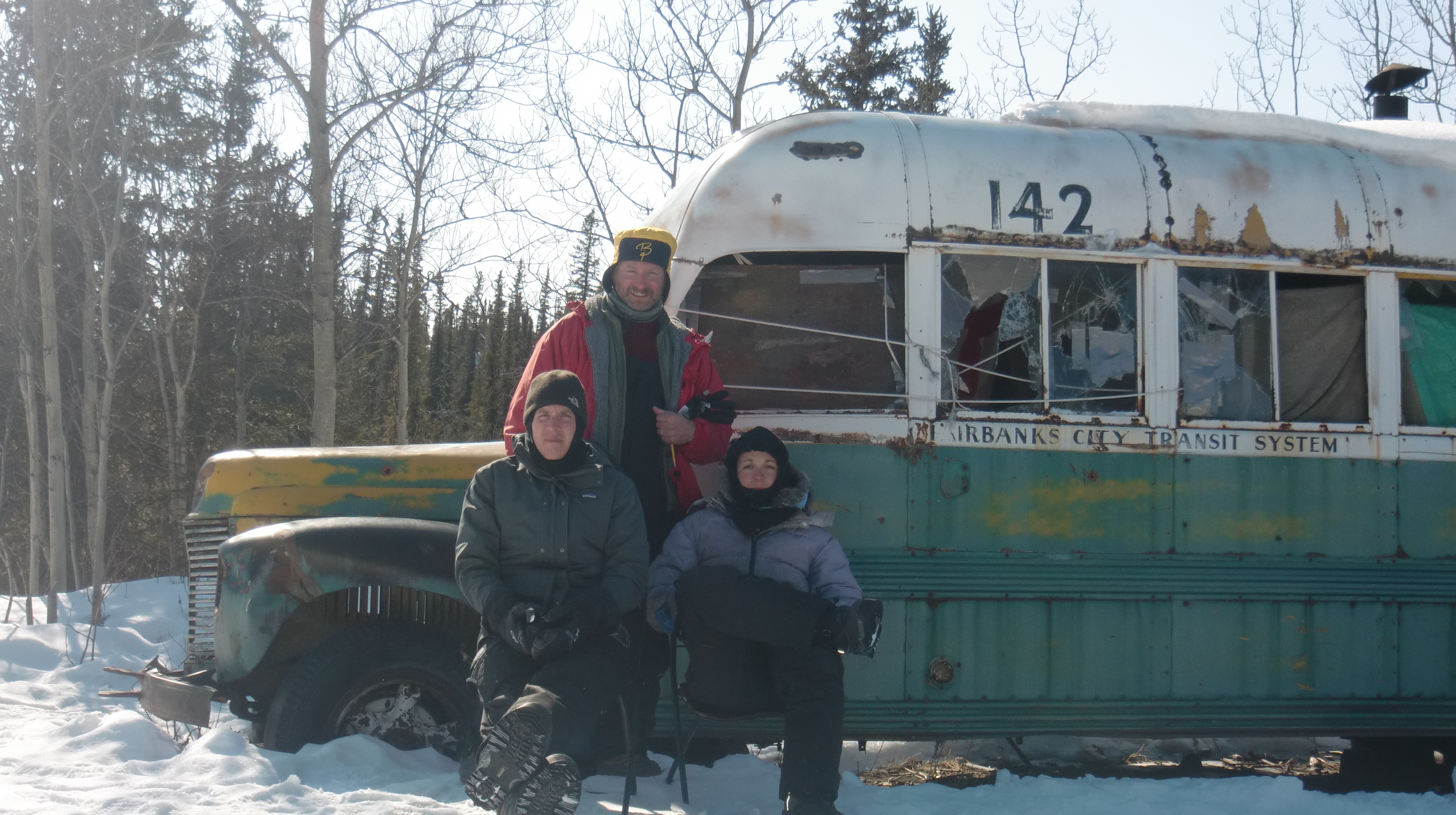 Left to right: John Krapek, Tom Lane, and Elizabeth Webb at the infamous Bus 142, approximately 28 miles from Healy, Alaska, on the Stampede Trail.