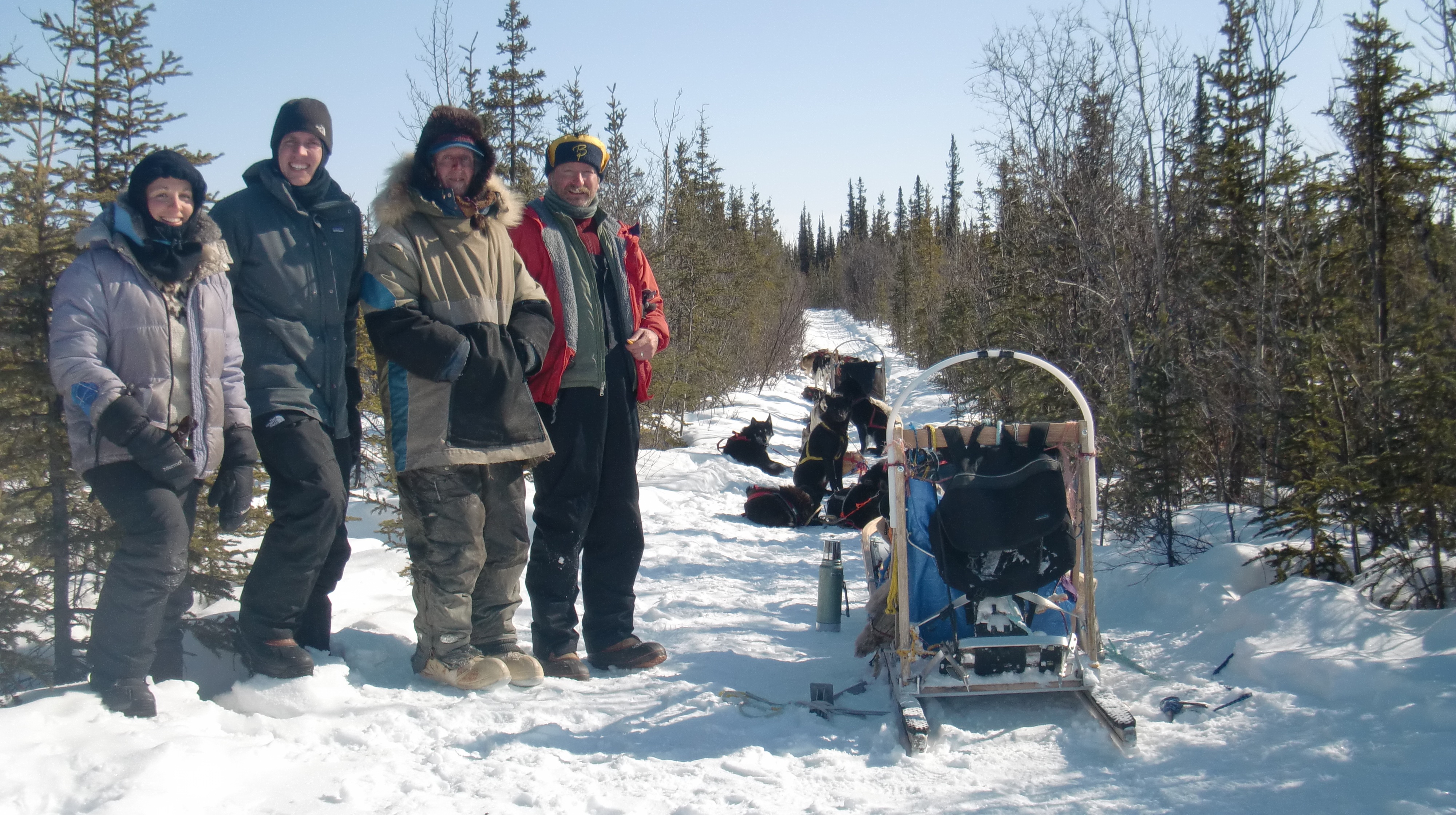 Elizabeth Webb, John Krapek, Mike, and Tom Lane pose with the dog teams on the Stampede Trail near Bus 142, approximately 28 miles from Healy, Alaska.