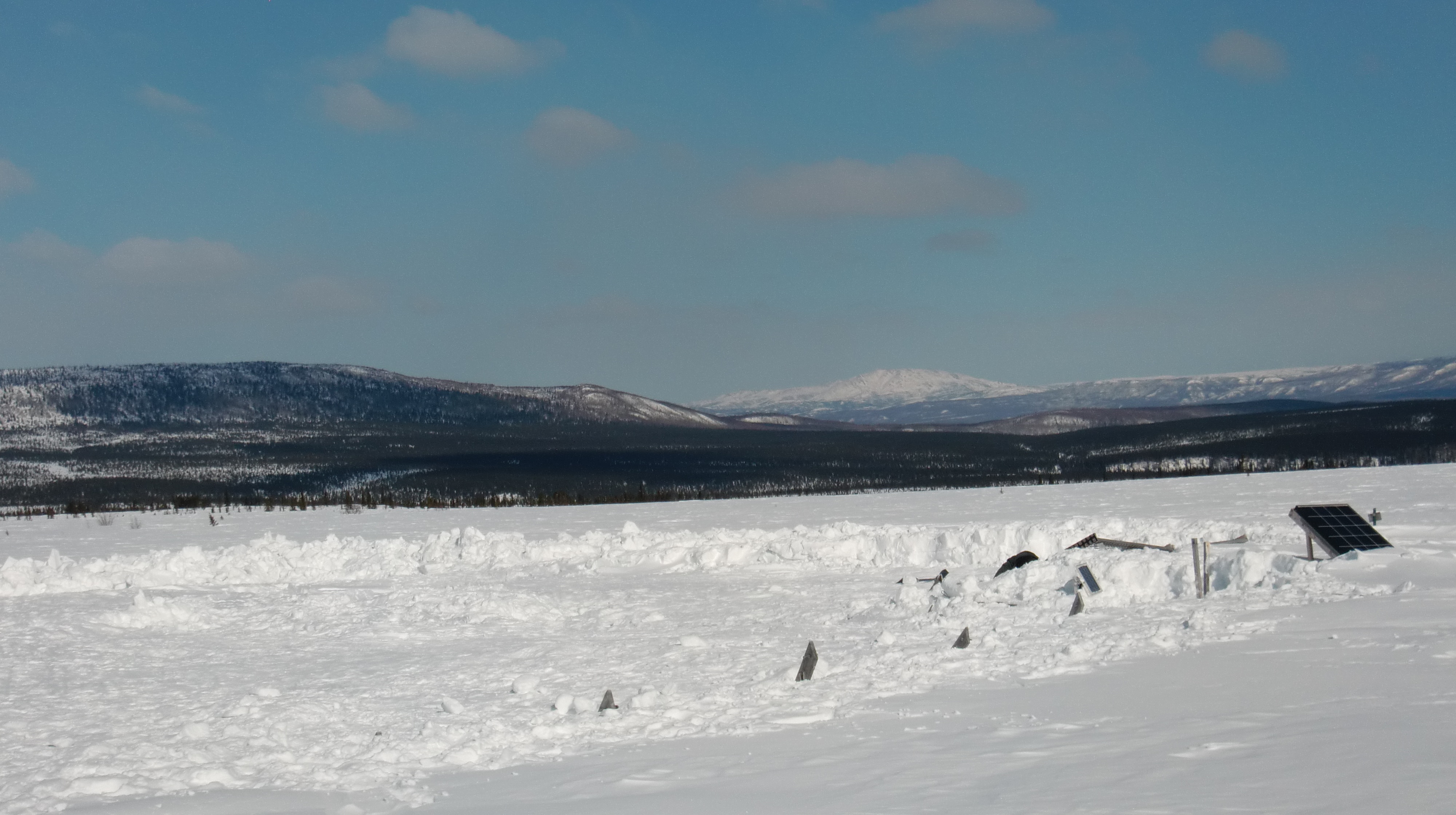 The snow level after shoveling at Plot B. John Krapek and Tom Lane removed the fences to prevent snow buildup on the warming part of the experiment. At the CiPEHR site, near Healy, Alaska.