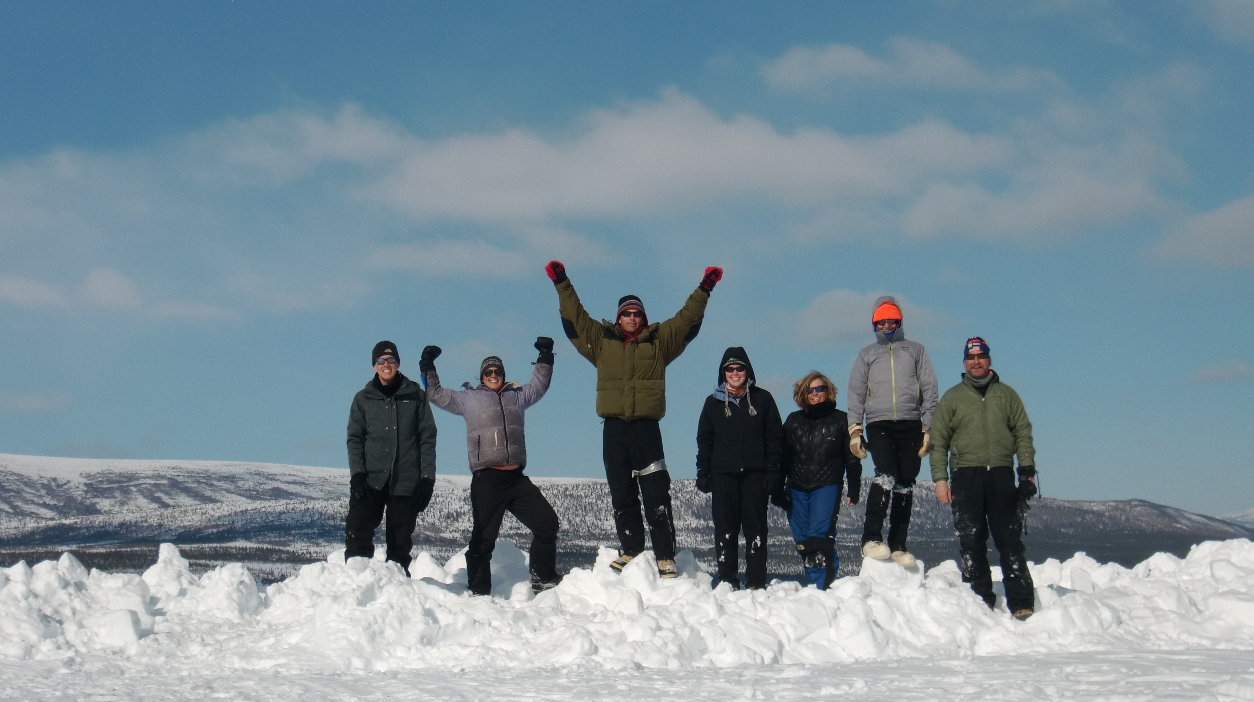 The shovel crew stands on piled snow at Plot C after shoveling all week. At the CiPEHR site, near Healy, Alaska.