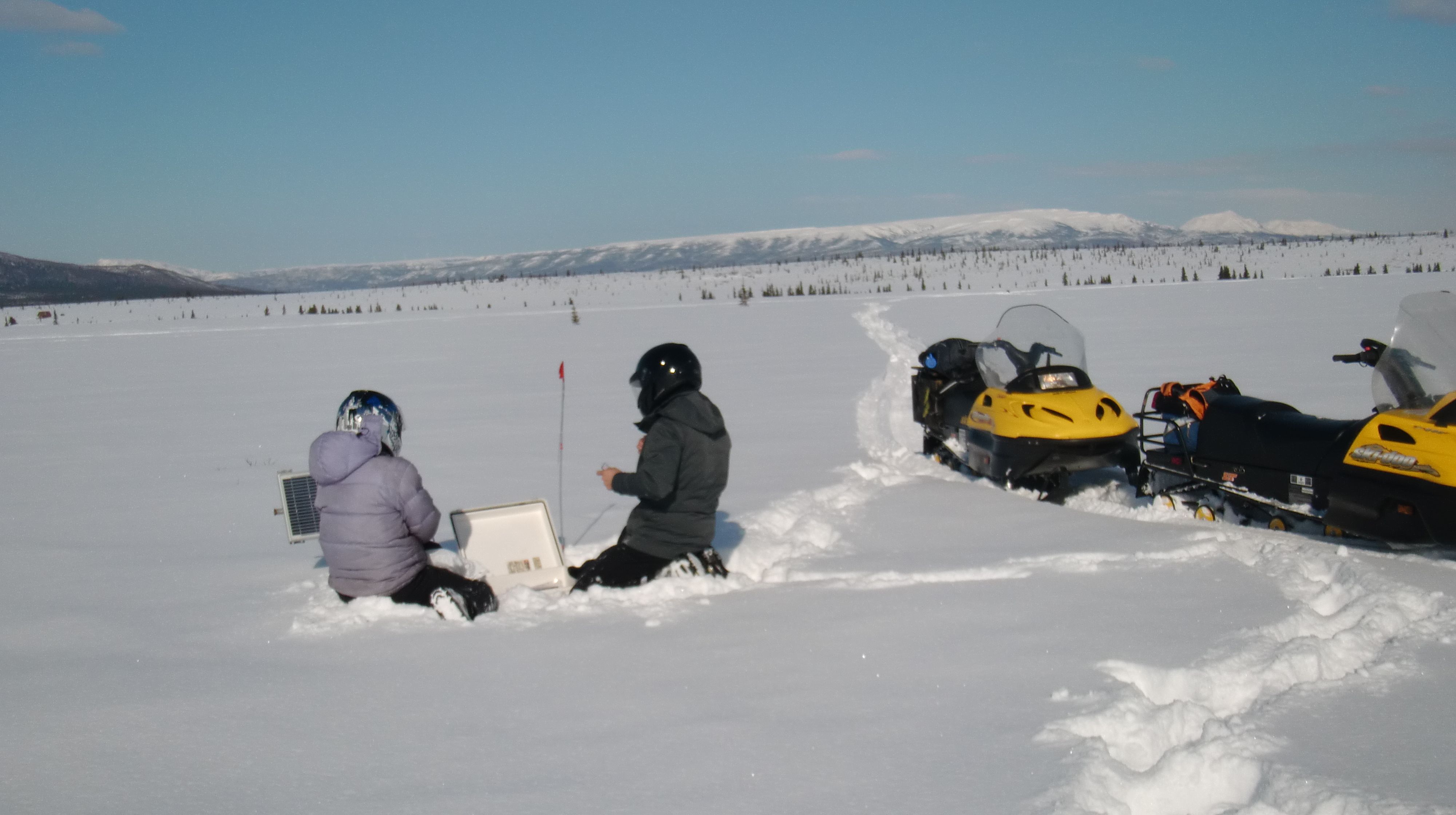 Elizabeth Webb and John Krapek change the data cards at the Thaw Gradient Site. At the CiPEHR site, near Healy, Alaska.