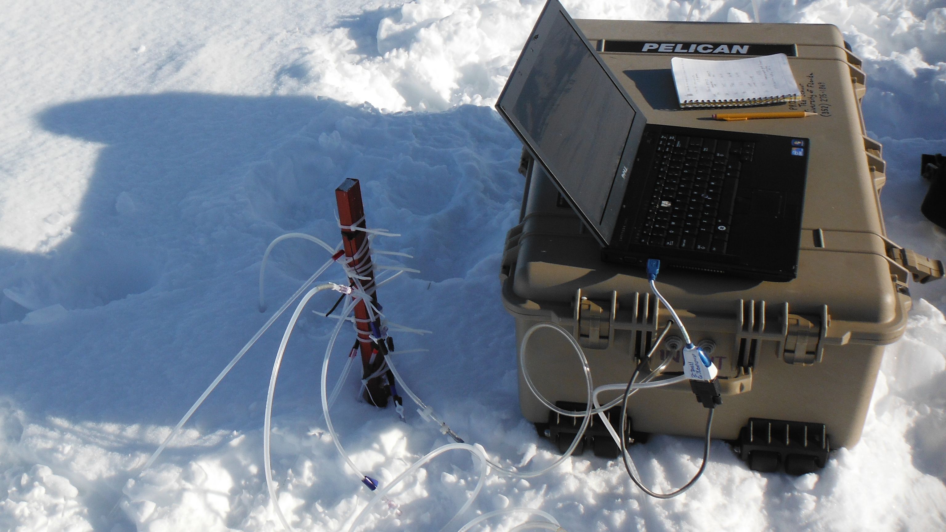Elizabeth Webb and John Krapek use a LI-COR CO2 analyzer to measure CO2 from tubes connected to sampling points under the snow at the warming plots (the fence plots). At the CiPEHR site, near Healy, Alaska.