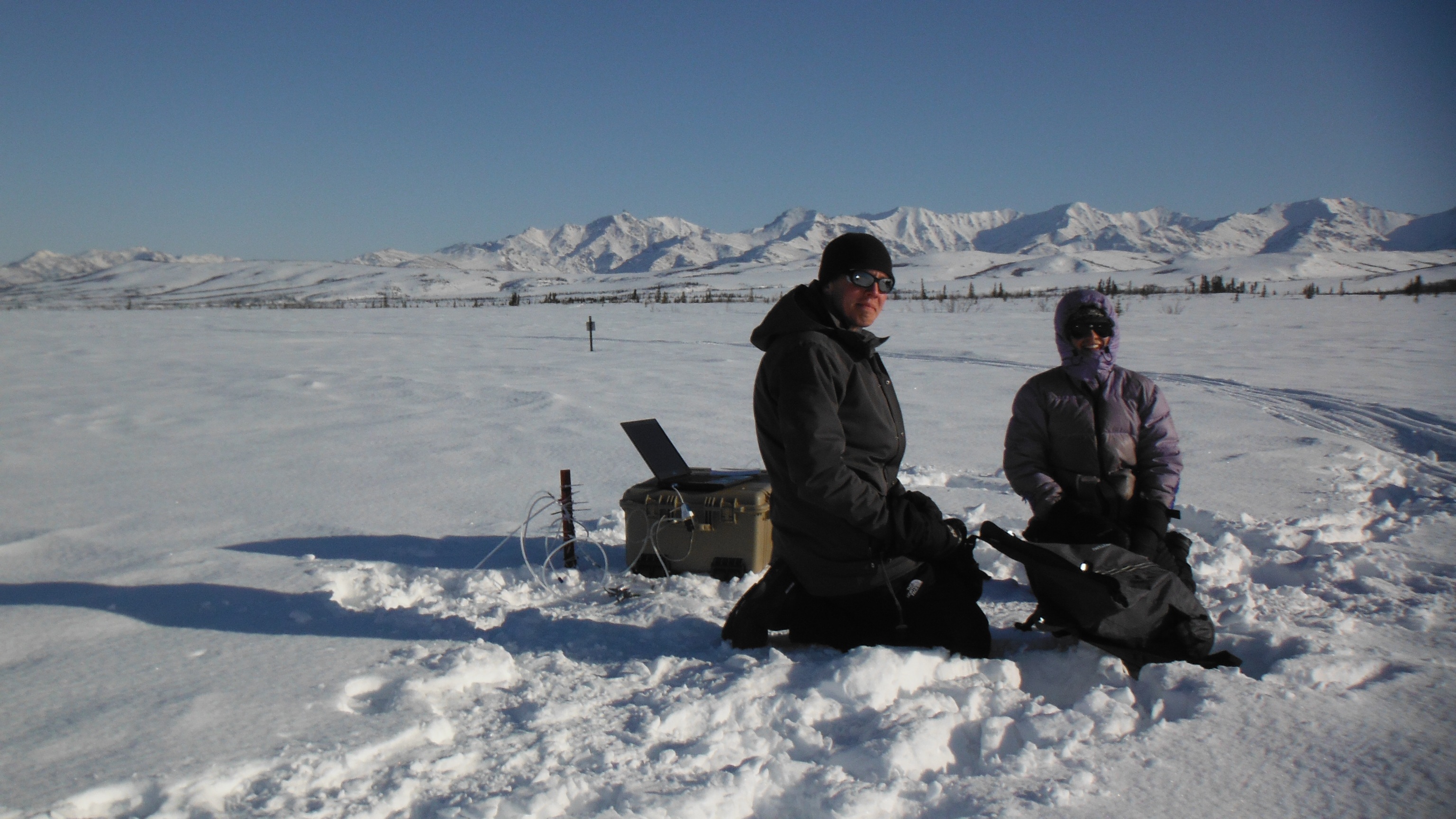 Elizabeth Webb and John Krapek use a LI-COR CO2 analyzer to measure CO2 from tubes connected to sampling points under the snow at the warming plots (the fence plots). At the CiPEHR site, near Healy, Alaska.