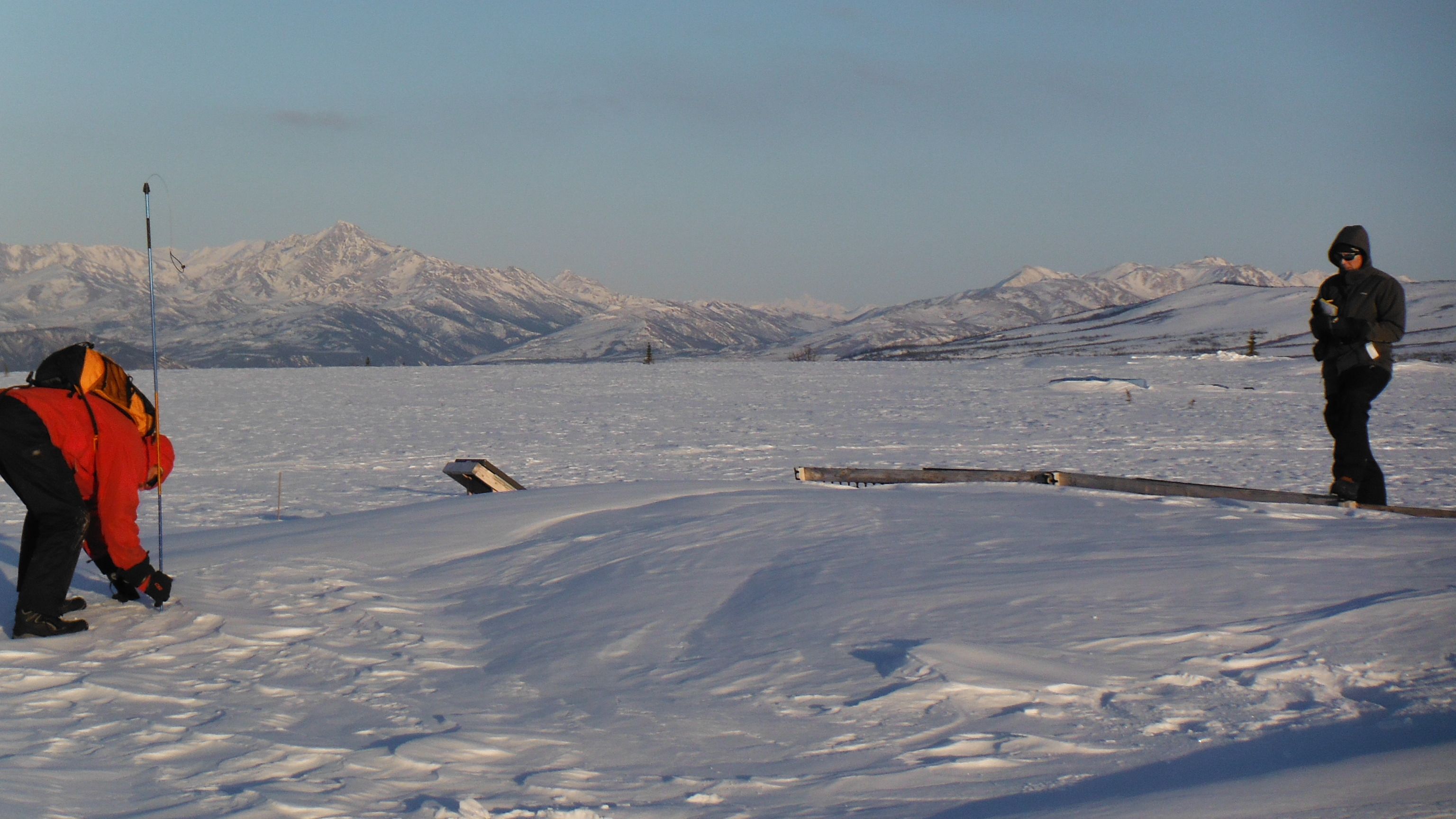 Tom Lane measures snow depth at the warming site. At the CiPEHR site, near Healy, Alaska.