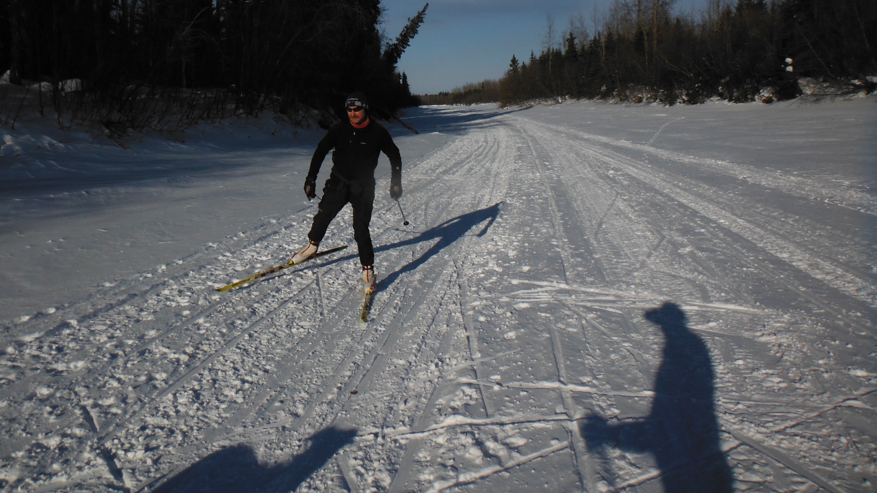 Tom Lane skies in the evening on the frozen Tanana River south of Fairbanks, Alaska.