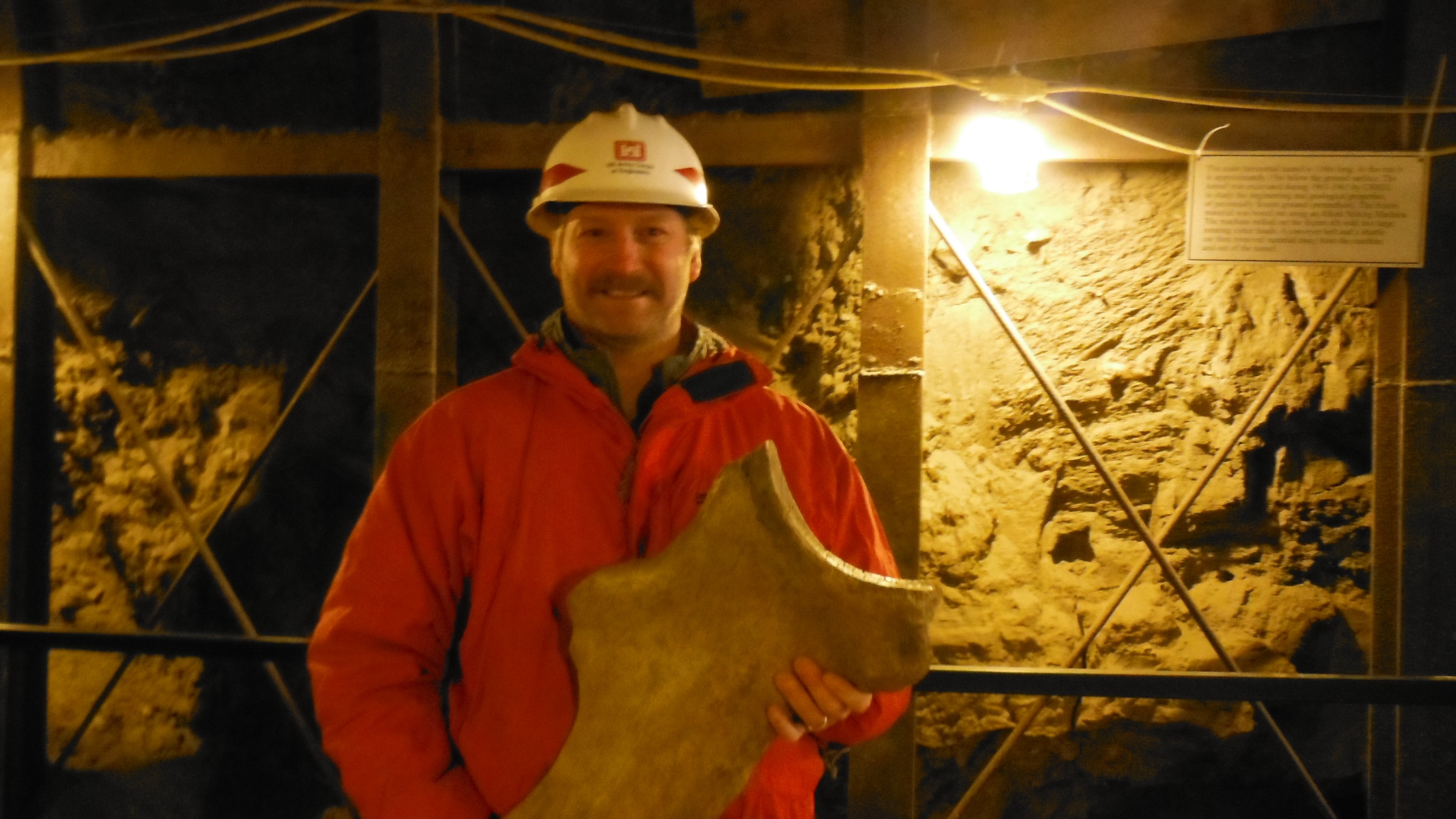 Tom Lane holds a fossil inside the Permafrost Tunnel maintained and operated by the U.S. Army's Cold Regions Research and Engineering Laboratory. Fox, Alaska.