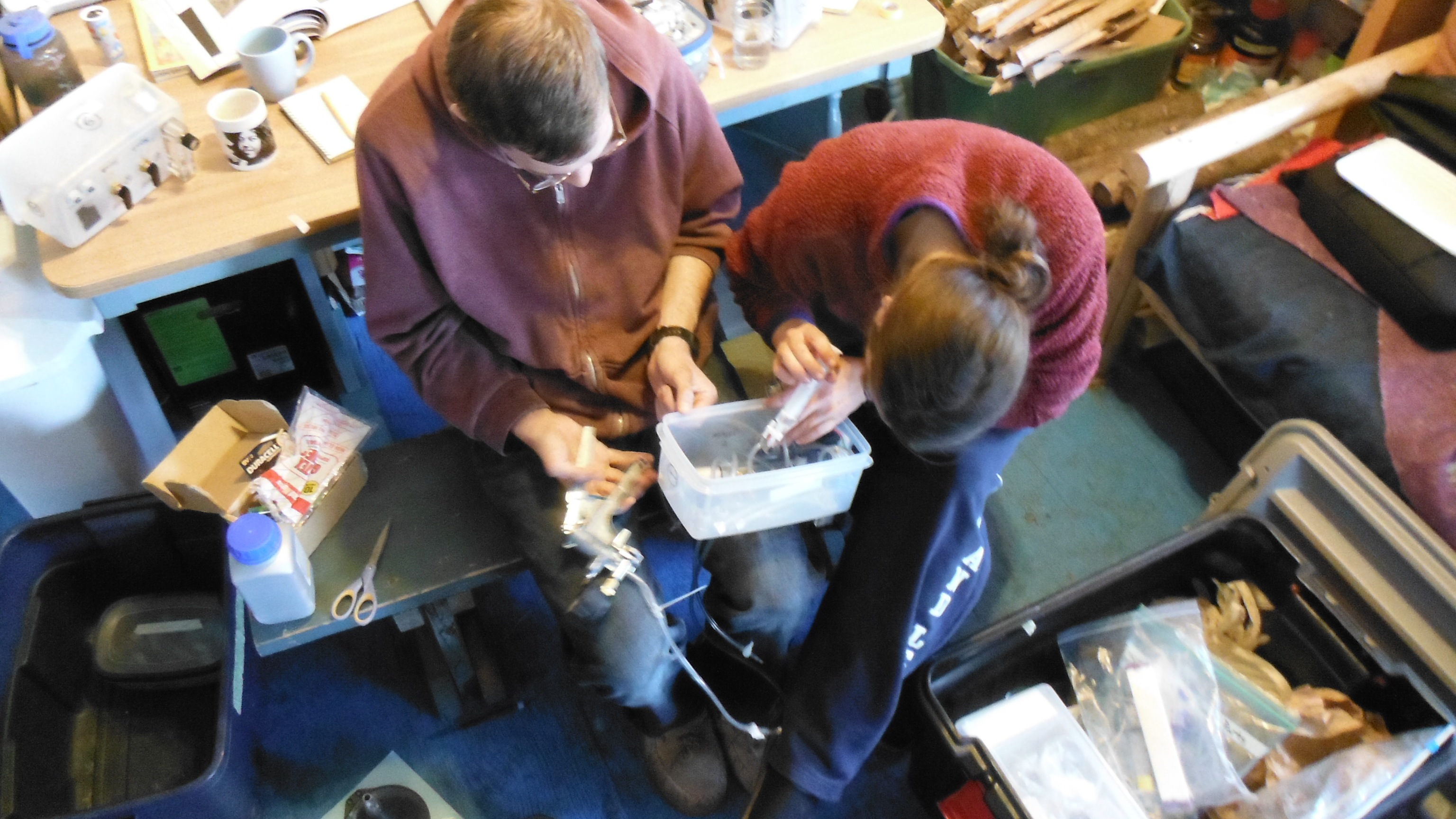 John Krapek and Elizabeth Webb construct a piece of equipment for trapping C14 to help date the age of the CO2 being produced at CiPEHR. Healy, Alaska.