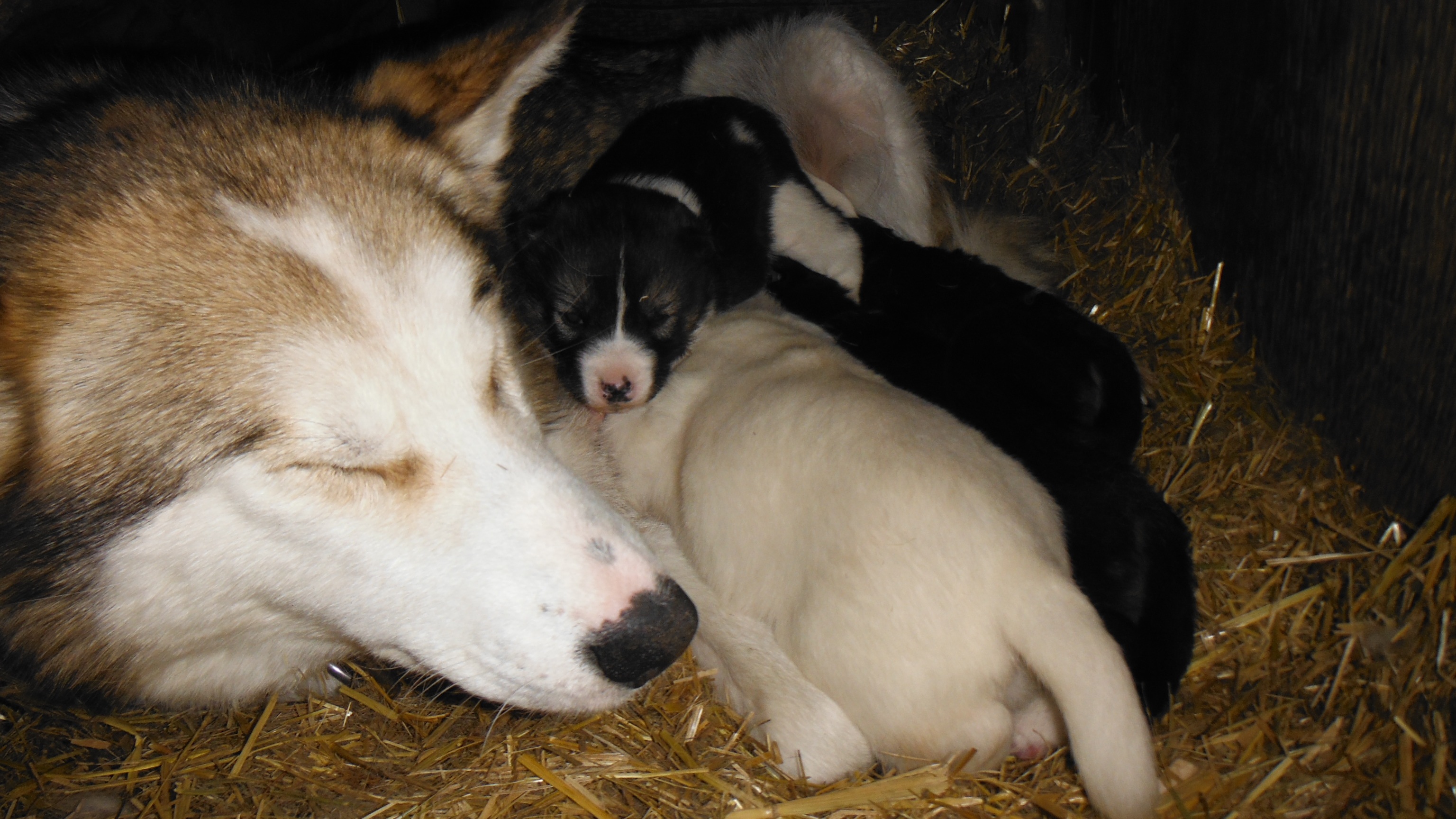 Tom Lane: "Jade and her puppies comfortable in their house in the dog yard at the field site cabin. The puppies are about 3 weeks old." Healy, Alaska.