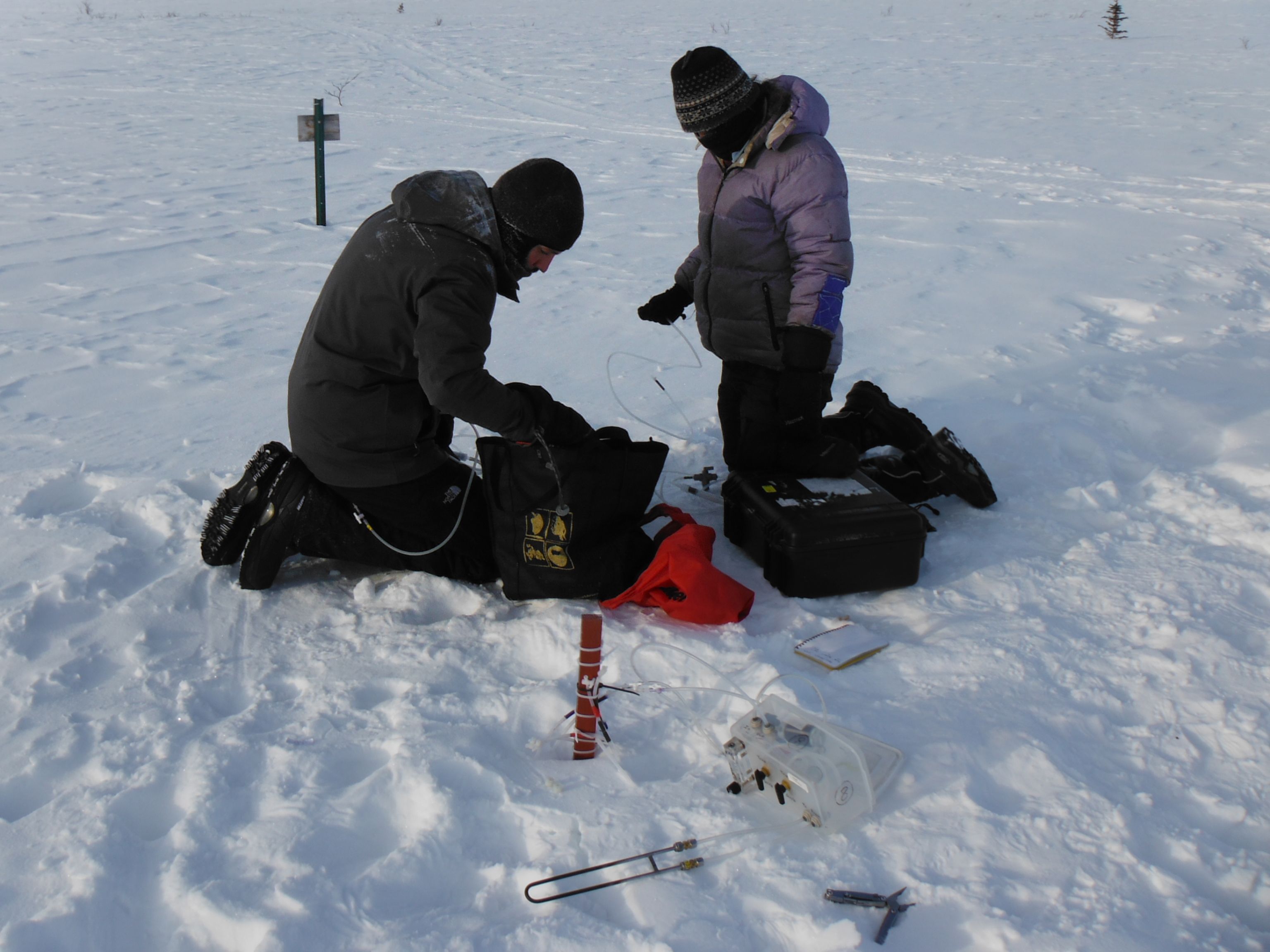 John Krapek and Elizabeth Webb troubleshoot the radiometric carbon collection apparatus. At the CiPEHR site, near Healy, Alaska.