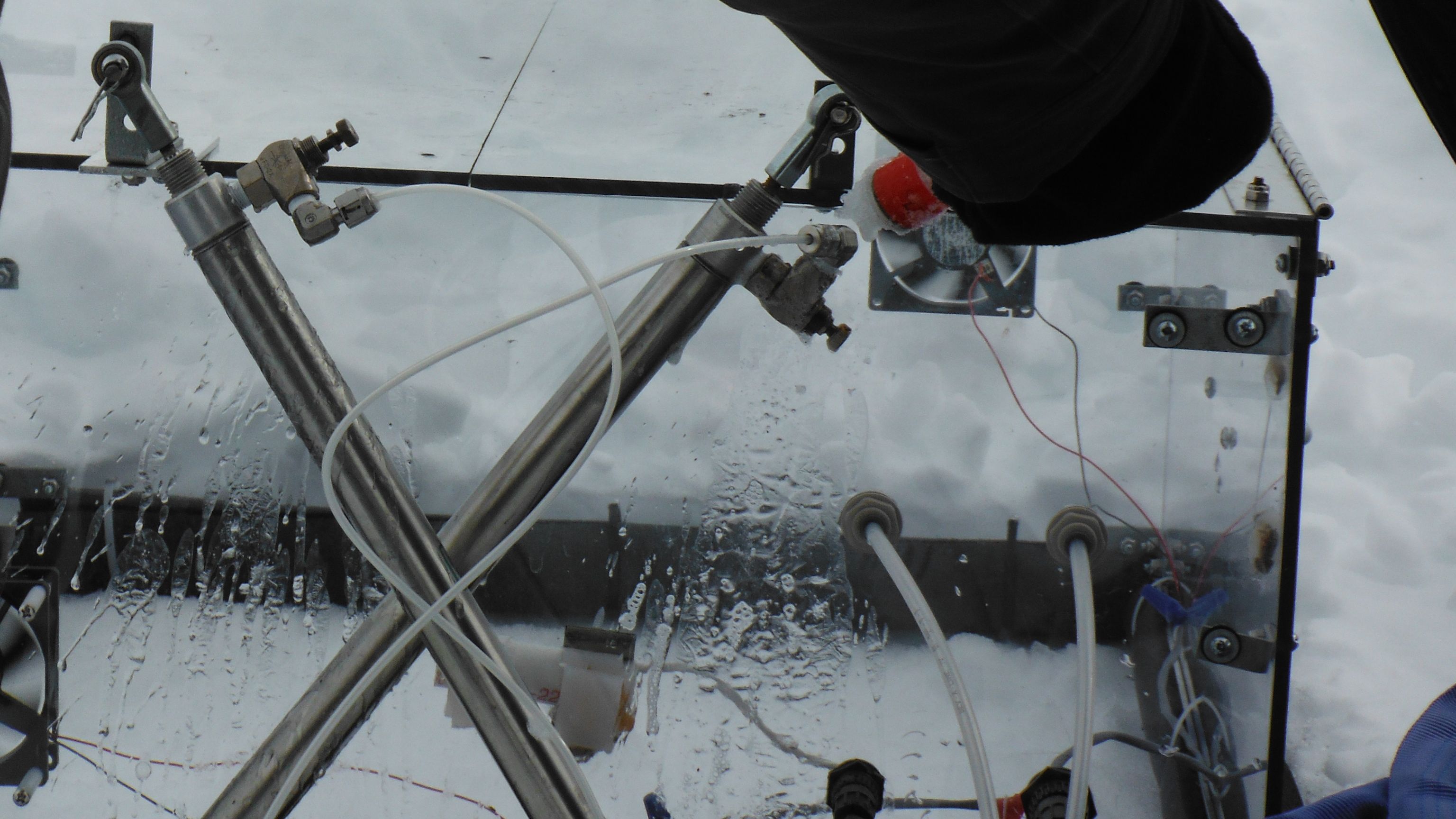 John Krapek uses a syringe filled with soapy water to test the pneumatic hose connections for air leaks. The pneumatic hoses are for the mechanical arms on the chambers. At the CiPEHR site, near Healy, Alaska.