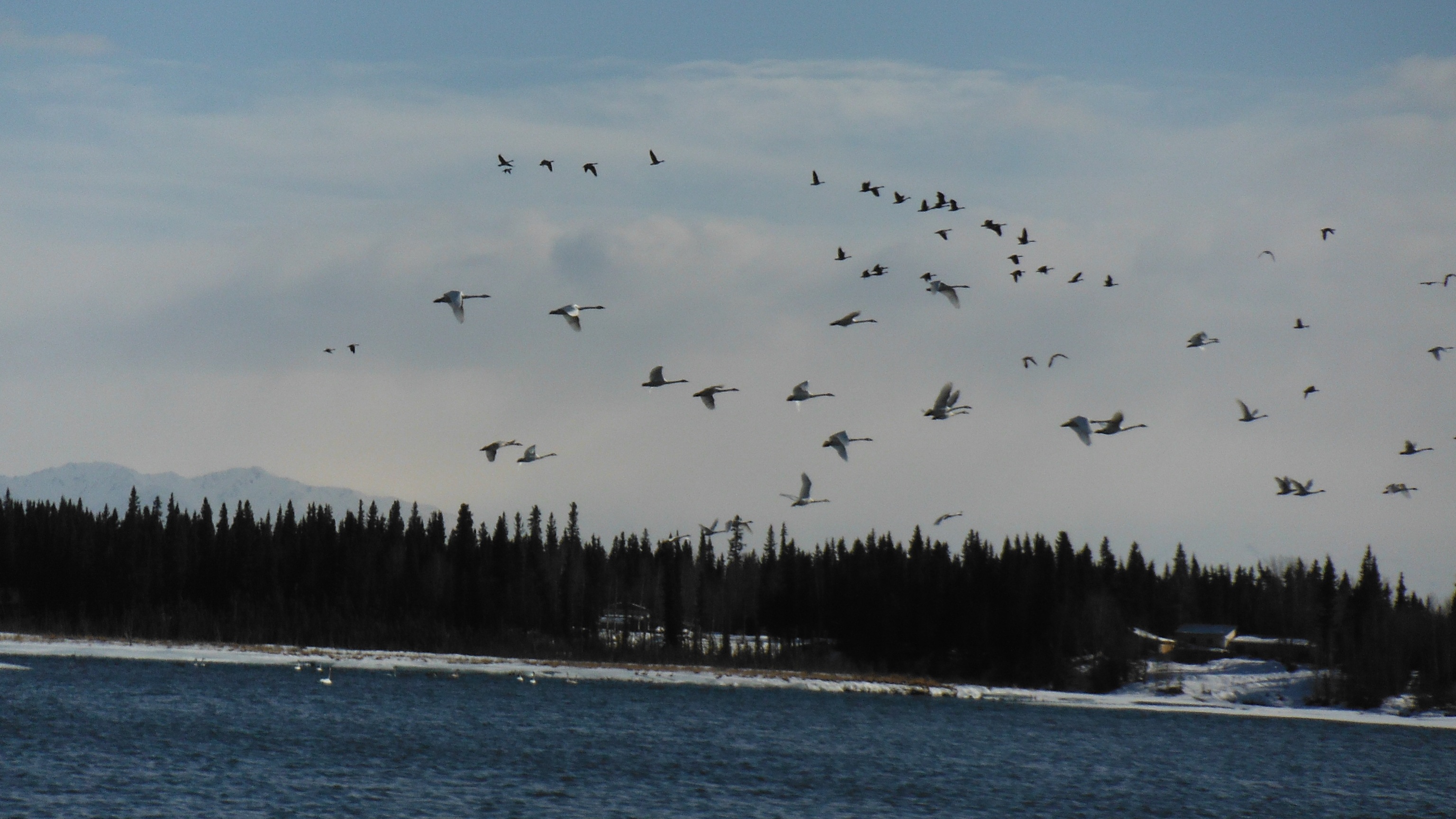As the team entered the last stage of the canoe trip into Clearwater Lake, a large flock of migrating geese, ducks, and trumpeter swans lifted off the lake. Clearwater Lake, Alaska.