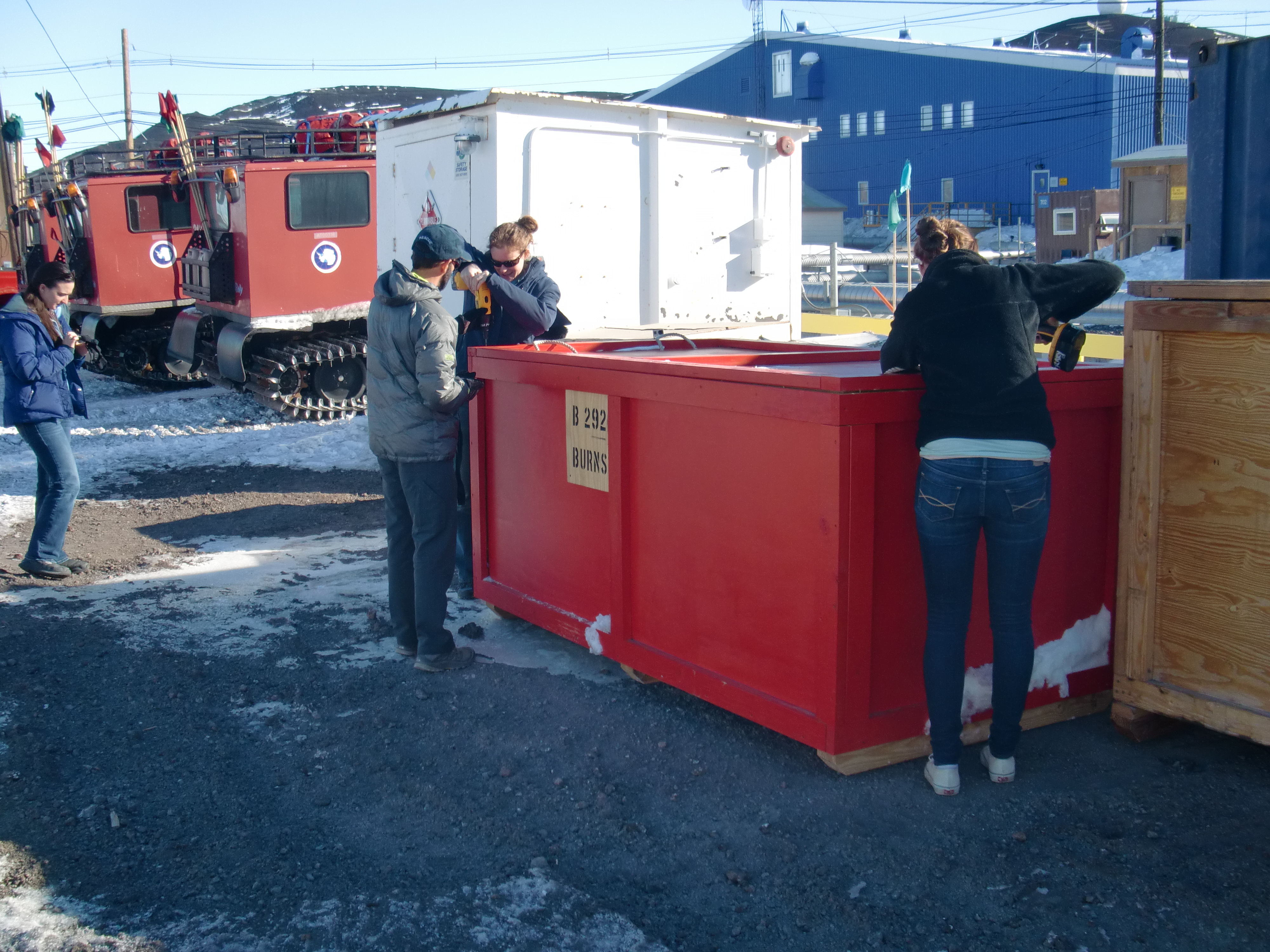 The team unloads two very large supply boxes. McMurdo Station, Antarctica.