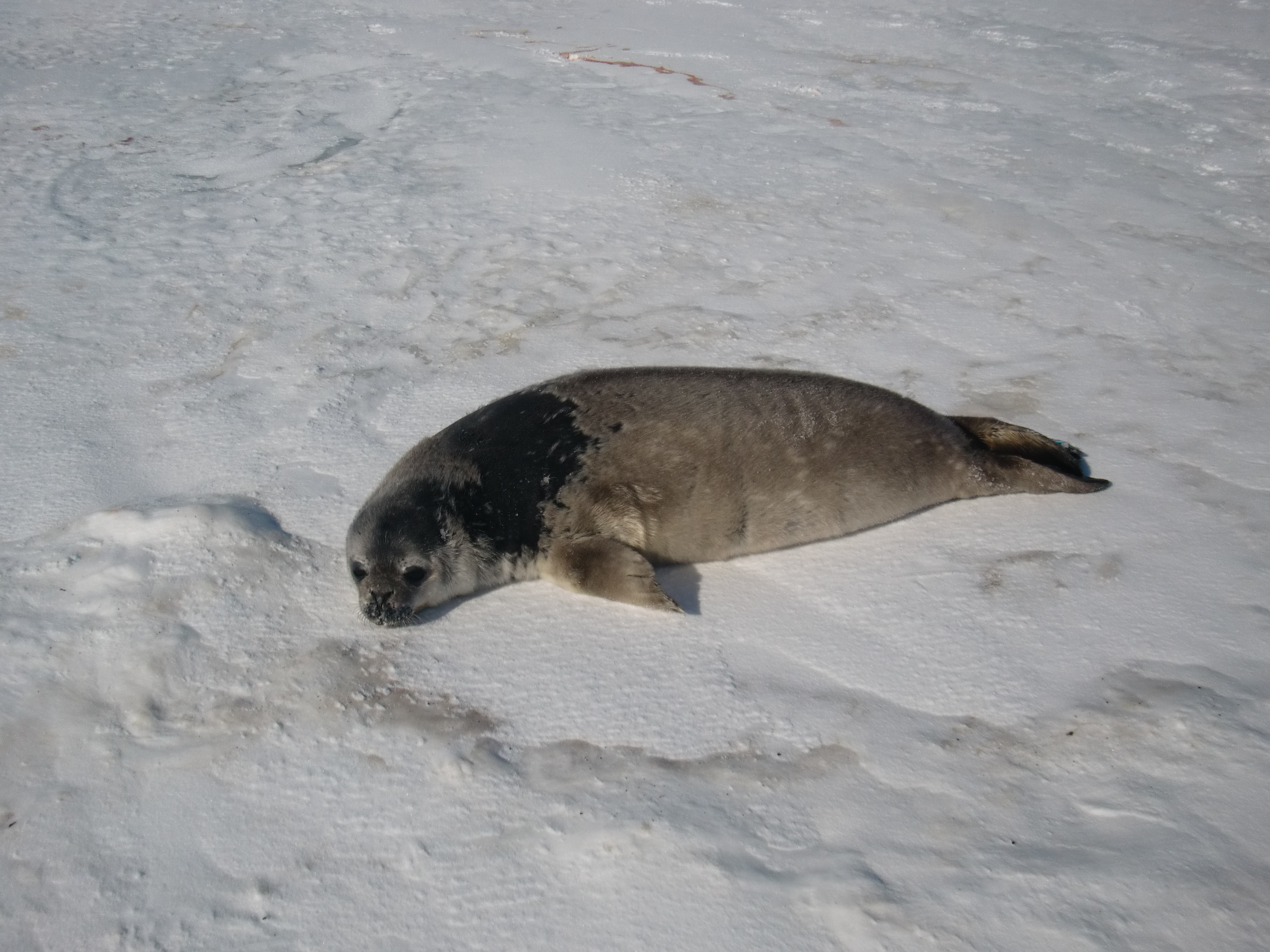 A Weddell seal pup laying on the sea ice out on the sea ice near McMurdo Station, Antarctica.