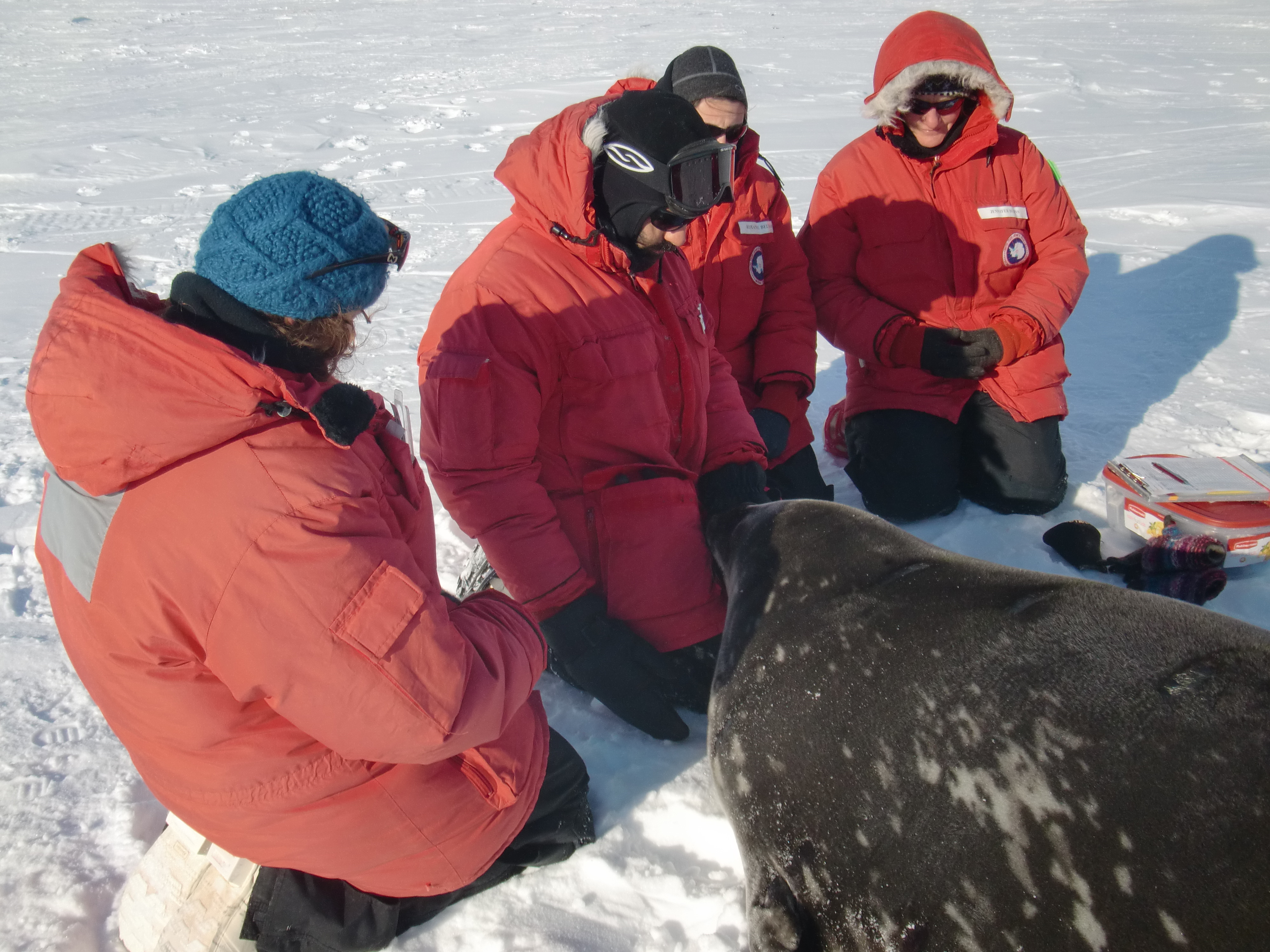 The team prepares to work with one of the first seals of the season. Out on the sea ice near McMurdo Station, Antarctica.
