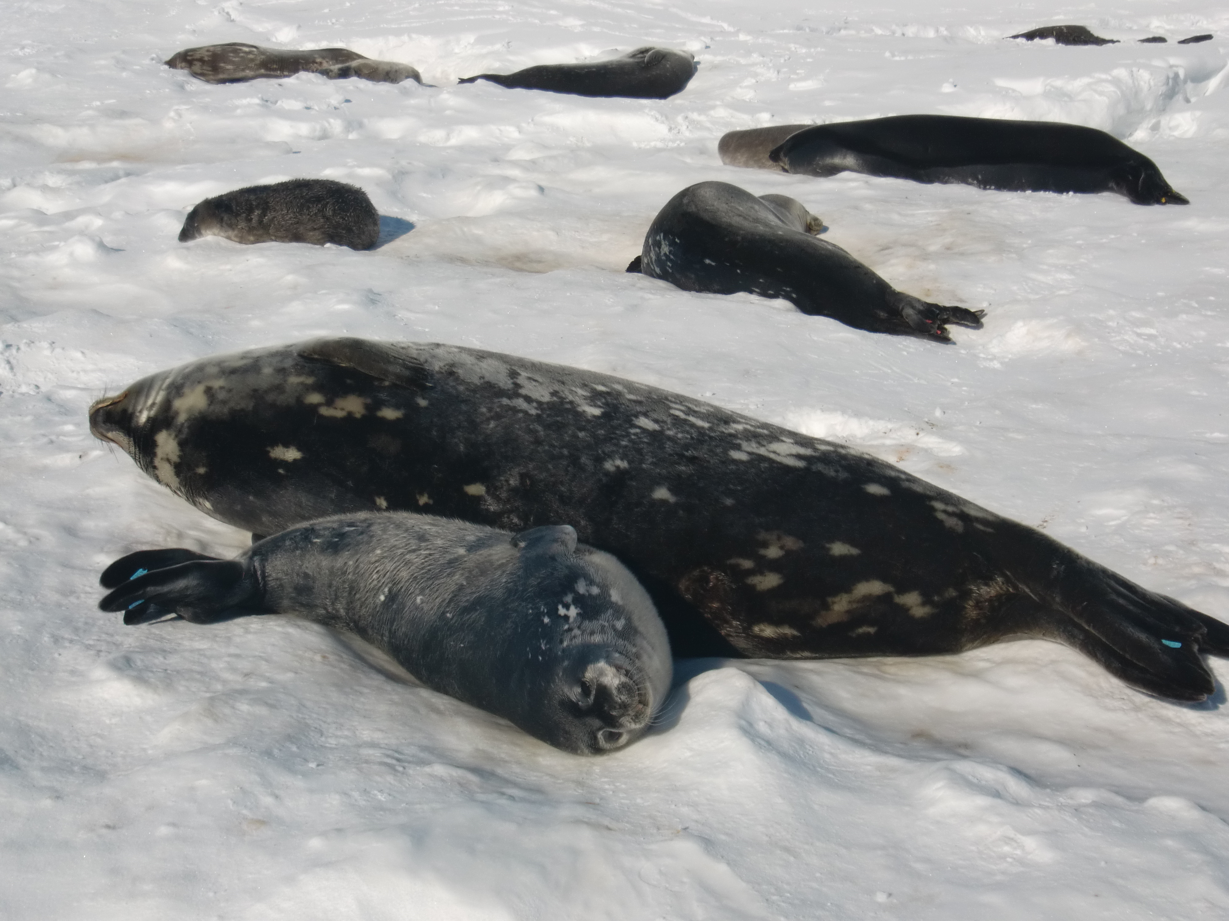 Weddell seals sleeping out on the sea ice near McMurdo Station, Antarctica.
